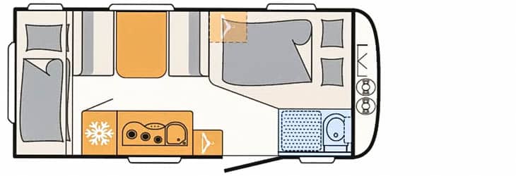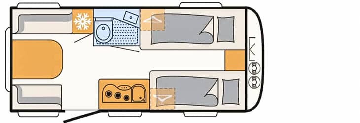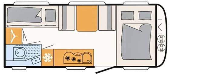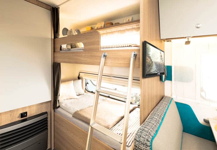 De Aero oogt strak en modern. Aan de buitenkant gladde beplating, een ingetogen zwart streepje en mooie 17 inch lichtmetalen velgen. Het interieur oogt lekker fris. Een lichte houttint en witte oppervlakken. Het combineert mooi met het grijs met een kleurig streepje van de stoffering. Er is keus uit drie varianten voor de stoffering. Prettig is ook de extra brede toegangsdeur. De Dethleffs Aero 2022 is er met enkele bedden, een Frans bed of een dwarsgeplaatst tweepersoonsbed. De indeling met stapelbed is uitermate geschikt voor het grotere gezin.