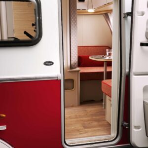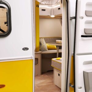 Naast de twee nieuwe indelingen heeft Eriba voor 2024 nóg iets in petto voor de Touring. Zo is de cultcaravan nu verkrijgbaar in drie mooie kleuren. De onderste helft van een Eriba Touring Colour Editions kleurt Nugget Gold, Tango Red of Harbour Blue, de rest is stijlvol wit aangevuld met rvs-bumpers, lichtmetalen velgen en een chroompakket. De kleurrijke uitstraling van de nieuwe Touring-caravans is binnen voortgezet. Zo gaat de speciale Nugget Gold-editie vergezeld van de stoffering ‘Memphis’, die bestaat uit warme geeltinten. De rode accenten van ‘Tulsa’ passen bij de elegante uitstraling van de Tango Red-caravan, terwijl het frisse ‘Orlando’ de Harbour Blue-editie perfect aanvult. Meubeldecor ‘Tindari’ – een moderne houtlook met fijne nerf – en de zachte binnenverlichting zorgen voor een gezellige sfeer.