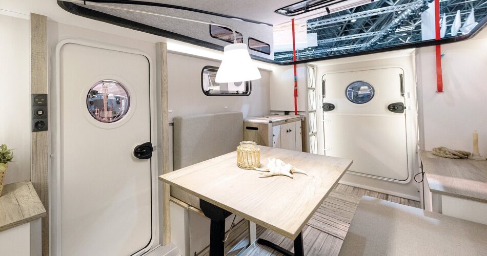 Verder bestaat het interieur uit een L-vormige zithoek. Deze is eenvoudig om te bouwen tot een tweepersoonsbed van 1,40 bij 2 meter. Om het slaapcomfort te verhogen leg je de topper die overdag dienst doet als rugleuning van de bank op de kussens. Je spullen kun je onder meer opbergen in de bakken onder de bank of in het kastje naast de zithoek. Net als bij de ‘normale’ Beachy zorgen de lichte en natuurlijke kleuren voor een echte strandhuis-look.