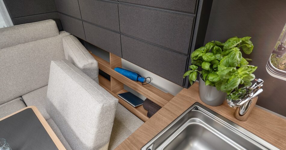 Een ander speciaal kenmerk van het interieur in de Knaus Azur is de Smart Wall. Dit is een met stof bekleed oppervlak aan de wand dat je kunt openklappen om de opbergruimte erachter te gebruiken, bijvoorbeeld om een koffiezetapparaat neer te zetten. Sowieso is er efficiënt omgesprongen met de ruimte, want ook achter de kussens van de zitgroep zijn opbergvakken gemaakt.