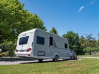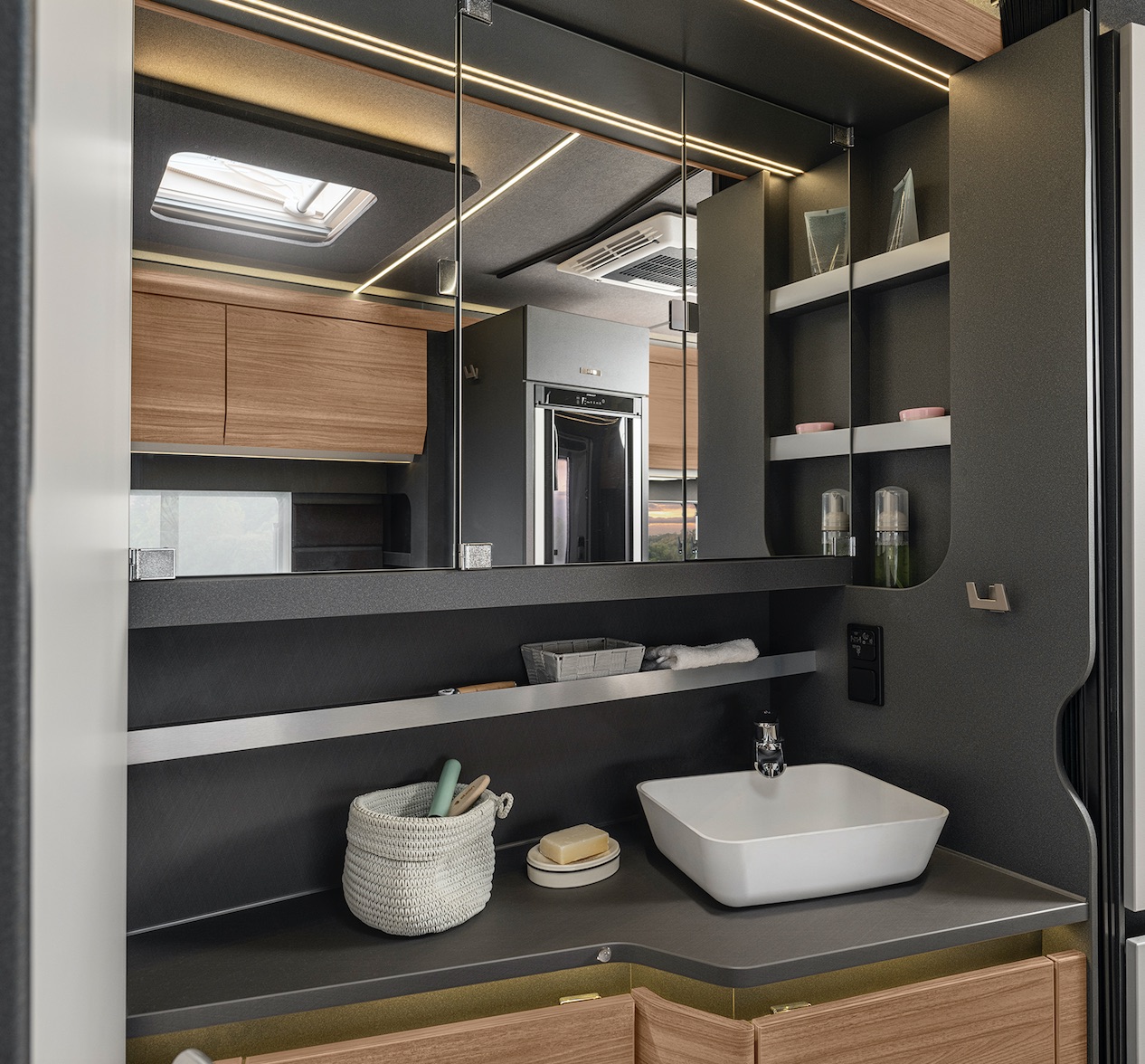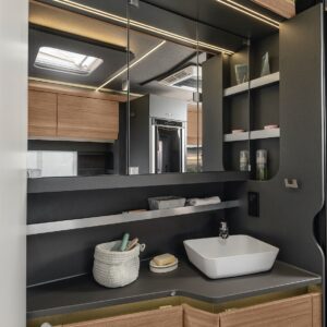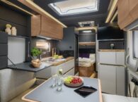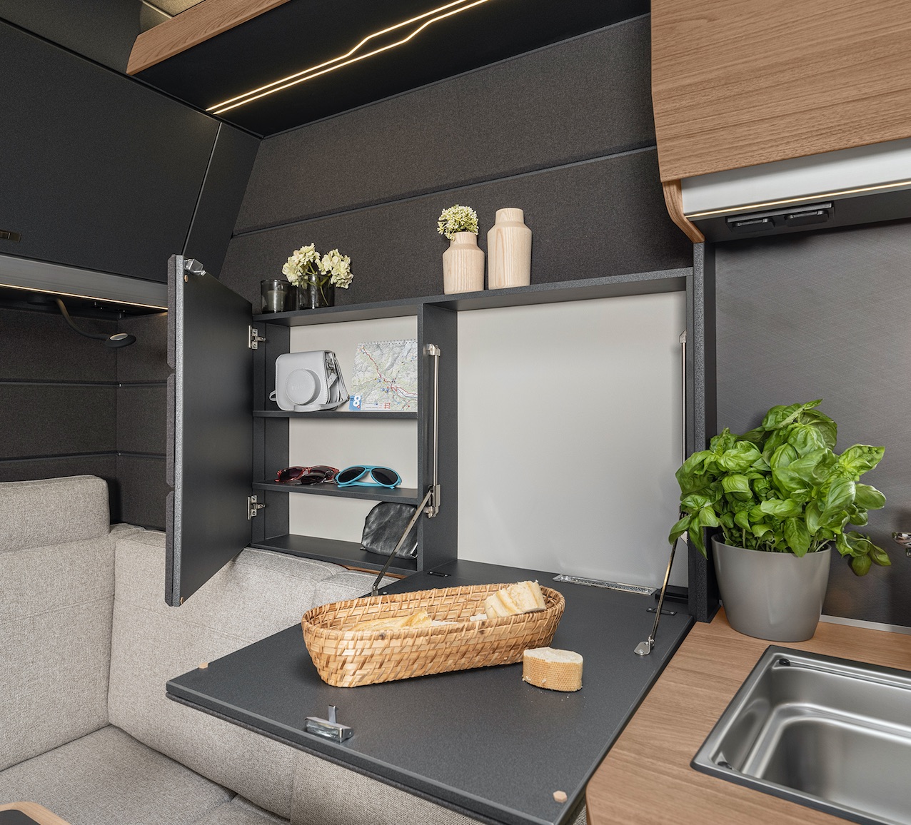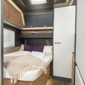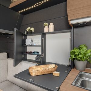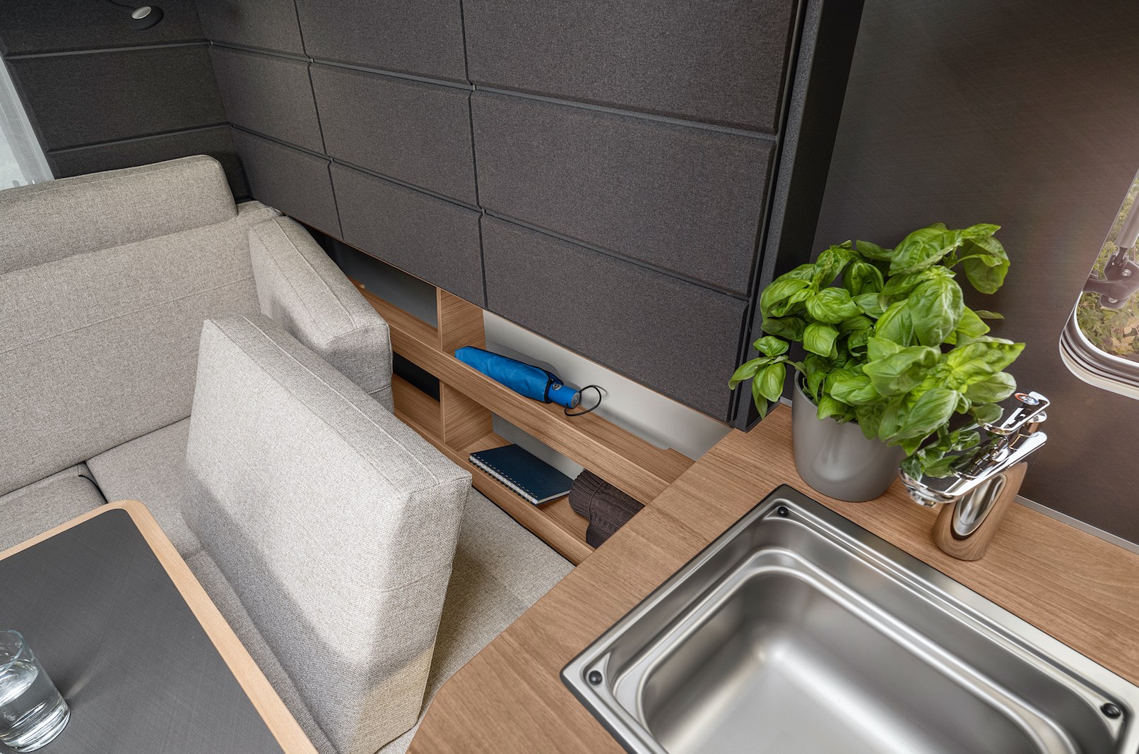 Verder is het meubilair – net als bij de campers van Knaus – schuin geplaatst. Dit creëert een ruimtelijk gevoel. De ruime keuken heeft een driepitskookplaat en een koelkast van 133 liter. Het slaapgedeelte, dat je van de rest van de woonruimte kunt scheiden door middel van een wand, is uitgerust met moderne leeslampen en opbergvakken.