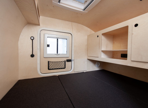 De teardrop heeft aan beide kanten een kleine deur met raam. De cabine is gemaakt van Baltisch berken hardhout multiplex, dat bekendstaat om zijn kracht, stabiliteit en hoge kwaliteit. Gezien de geringe afmetingen van de caravan zal het je niet verbazen dat de Rebel van binnen niet overloopt van luxe en ruimte. Eigenlijk bestaat het interieur alleen uit een tweepersoonsbed van 1,40 x 2 meter met daarboven houten kastjes. Het bed kun je ombouwen tot een zitbank, zodat je ook met slechter weer binnen kunt zitten. En dat zie er toch echt wel knus uit. Led-verlichting is standaard, evenals een dakluik. Optioneel kun je kiezen voor een verwarming en/of airconditioning.