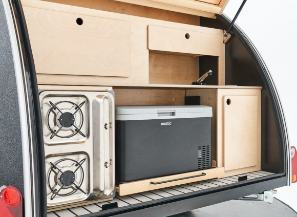 Een kleine caravan heb je alleen als je van plan bent je vakantie grotendeels buiten door te brengen. En dat is dan ook precies waar je staat als je kookt. De Kulba Rebel heeft een keuken onder de achterklep. Compleet met een wasbakje en kraan, kastjes, een optilbaar tafelblad met geïntegreerd tweepitsgasstel, stopcontacten en optioneel een koelkastje of -box. Dus eigenlijk alles wat je nodig hebt om een maaltijd te bereiden is aanwezig in de Kulba Rebel. Deze leuke minicaravan is er vanaf 17.750 euro.