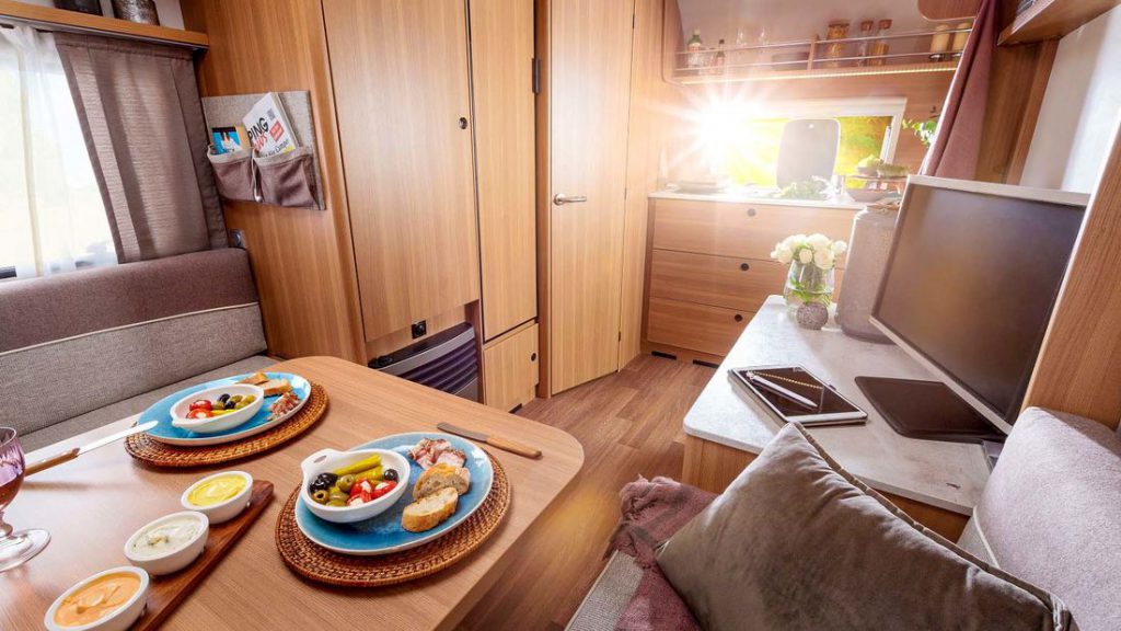 Vrij recent lieten we hier nog de Premio 410 TS van Bürstner zien. Deze compacte caravan heeft geen vast bed, maar een hefbed dat boven de zithoek hangt. Zo creëer je in een compacte caravan toch een ruim interieur. Met zijn Style 400 F – die uit dezelfde fabriek rolt – doet LMC nu bijna hetzelfde trucje, maar dan anders. In deze caravan geen hefbed, maar een opklapbed met een afmeting van 1,90 bij 1,50 meter. LMC spreekt van een unieke indeling. Dat is niet helemaal waar, want eenzelfde opklapbed zien we ook in de Spaanse Across Car-caravan. Dat neemt niet weg dat een dergelijk bed bijzonder is. Het opklapbed zit vast aan aan de achterwand van de caravan. Opgeklapt is het amper zichtbaar.