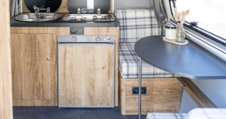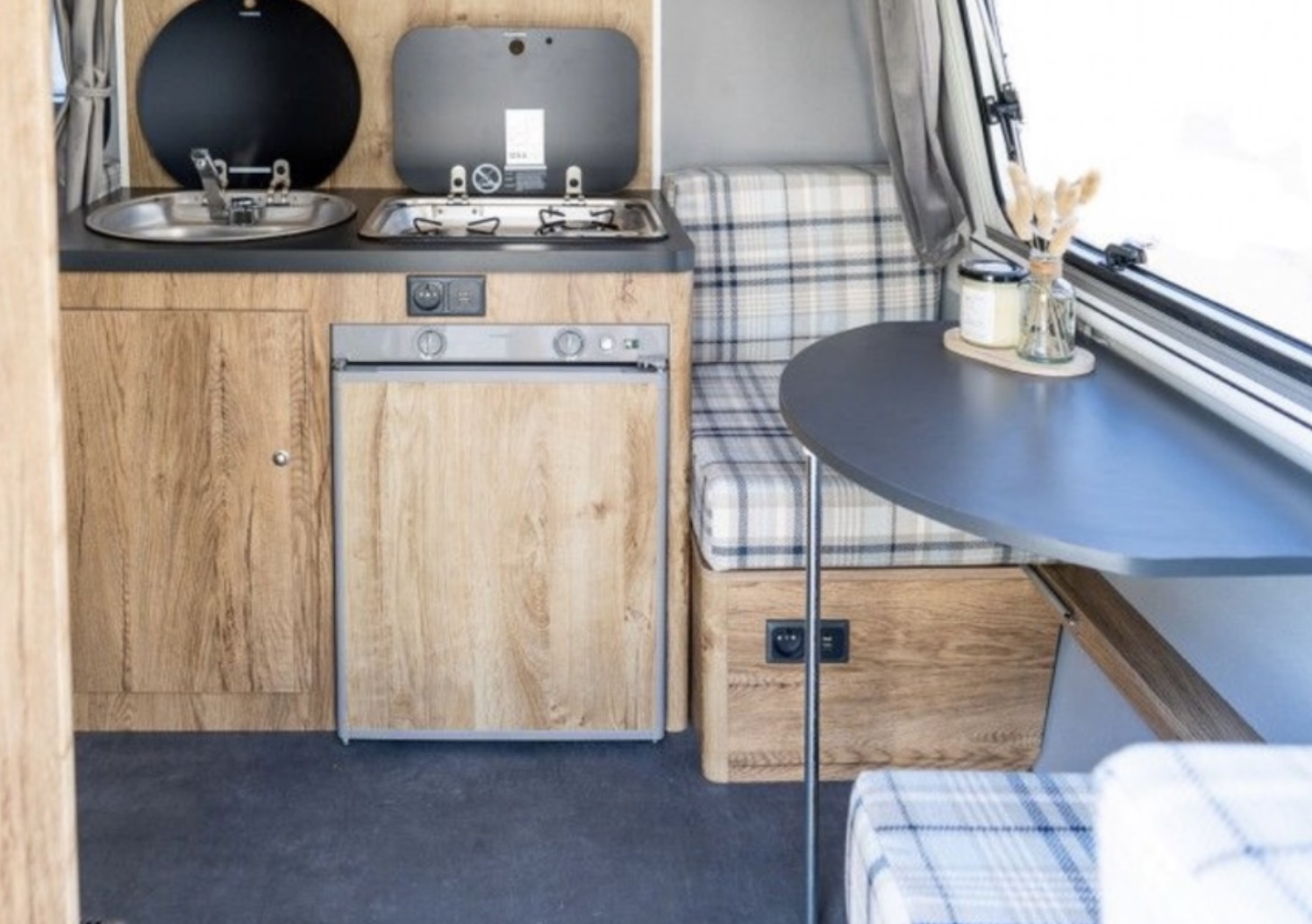 Binnenin valt vooral de geruite stoffering op. Deze is dan ook speciaal voor het jubileum ontworpen. De stof, de lichtgrijze wanden, een antracietkleurig tafel- en werkblad en een robuust houtdecor op de kasten geven de caravan een klassieke look met een modern tintje.