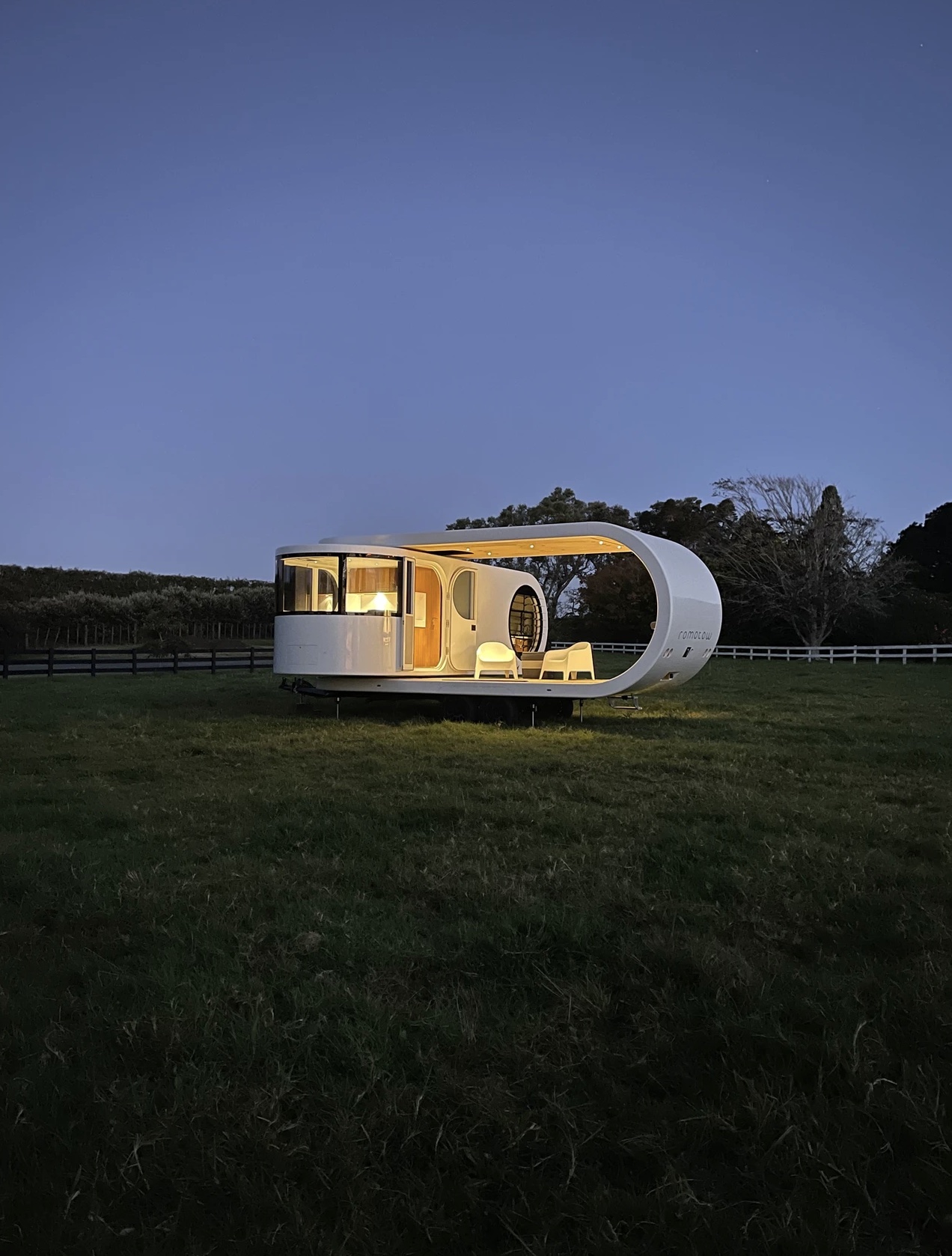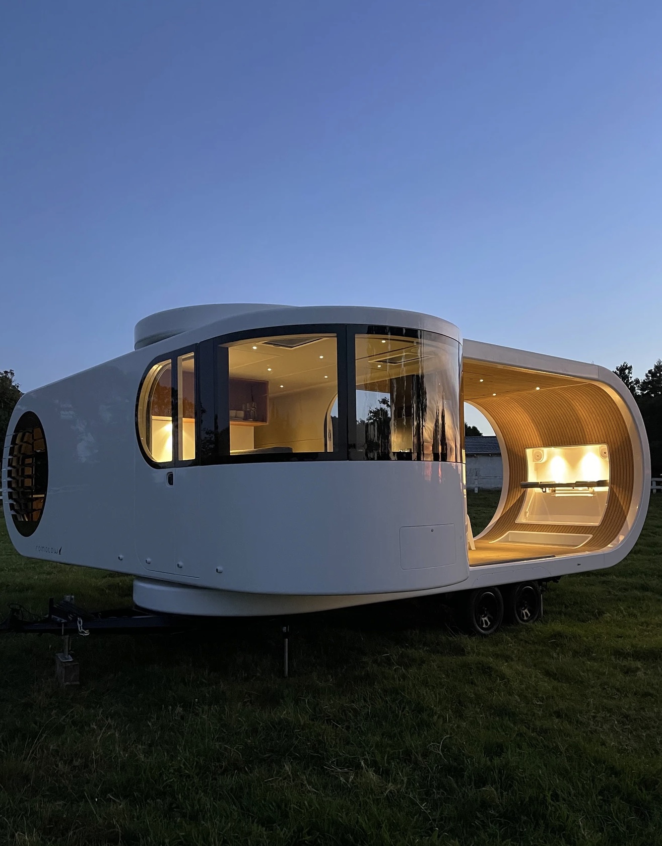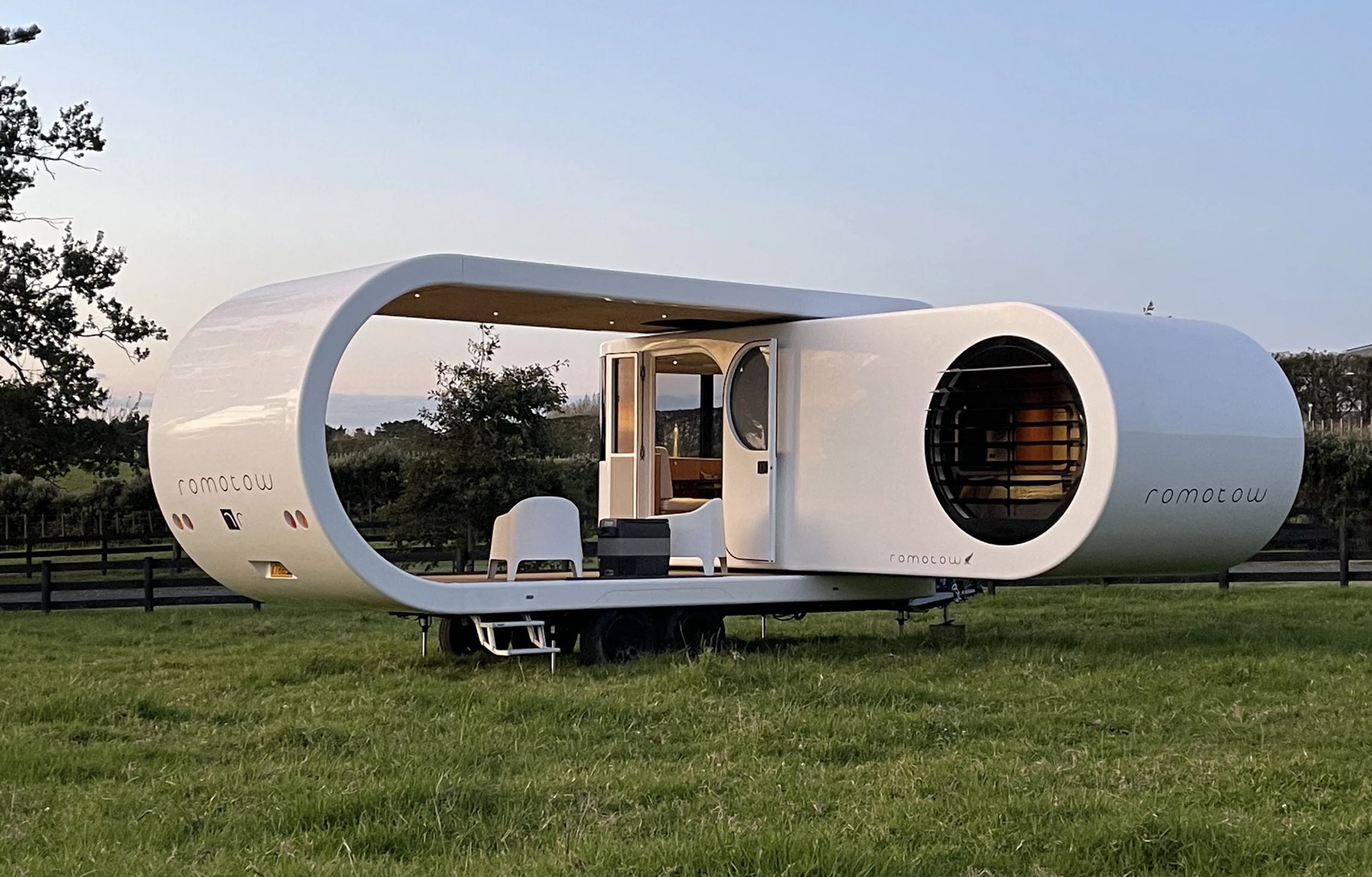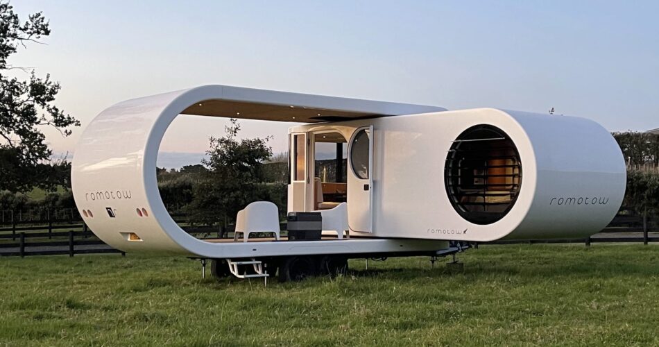 Een ronddraaiende caravan mét terras. Nee, dit is geen grap, maar het geesteskind van het Nieuw-Zeelandse architectenbureau W2. De Romotow T8 ziet er in eerste instantie uit als een normale, zij het wat luxe, caravan. Met één druk op de knop kan de caravan echter 90 graden draaien en verschijnt er een overdekt terras.