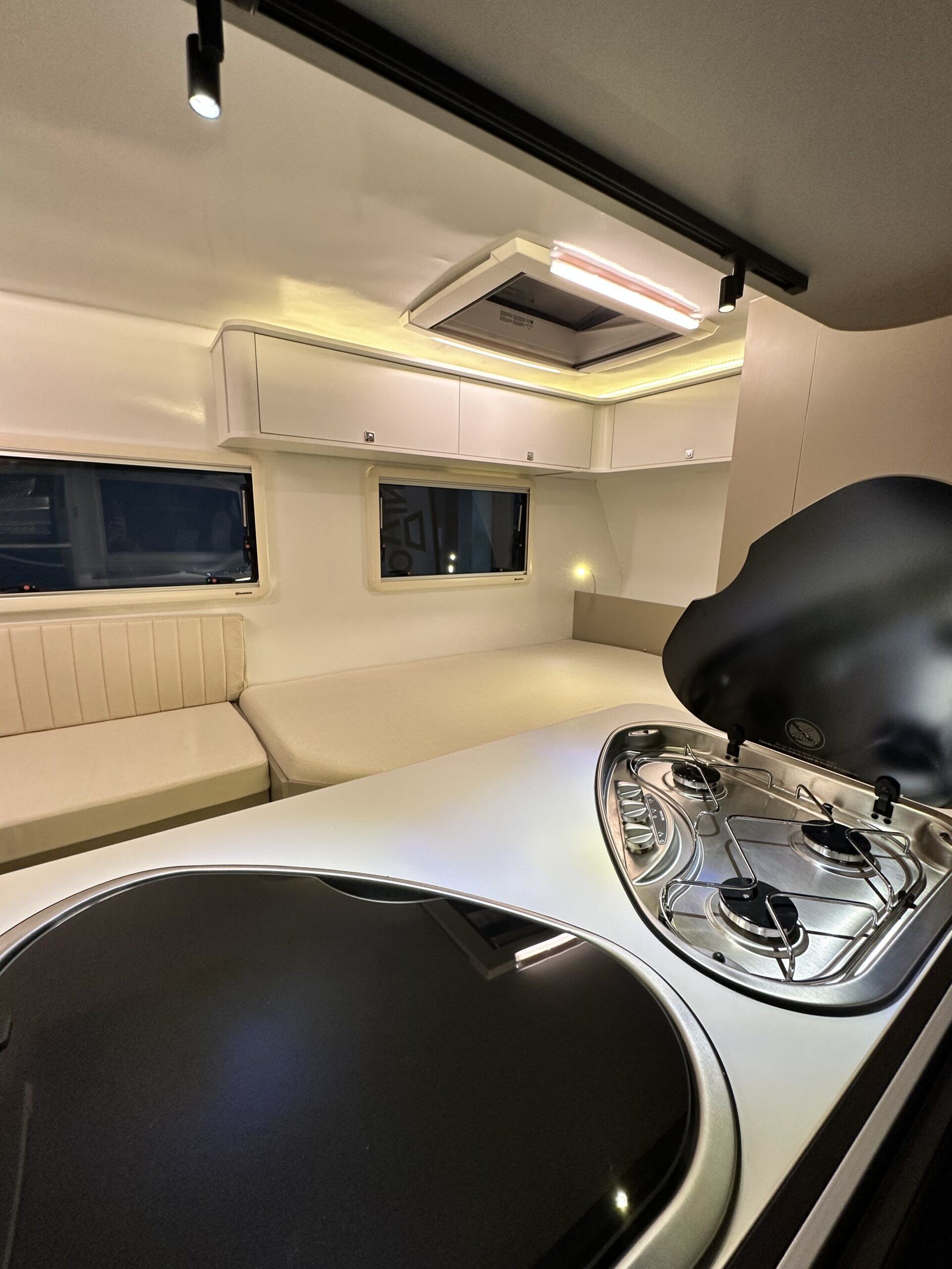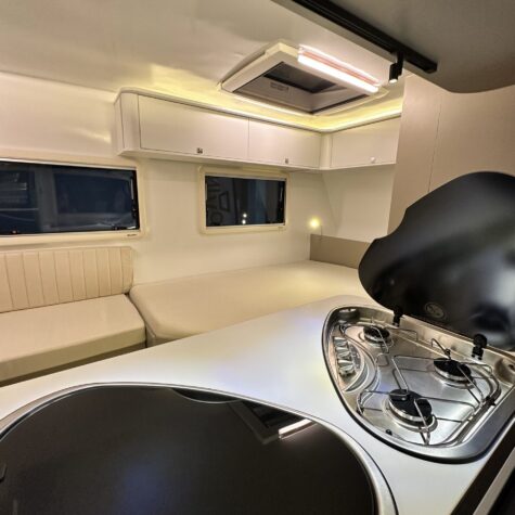 Het interieur oogt modern en elegant met vooral wit en beigetinten. Voor Rovinns is alleen het beste goed genoeg. B-merken zul je dus niet aantreffen in de Gaia. In de keuken zien we een driepitskookplaat met glazen deksel en compressorkoelkast met een inhoud van 90 liter, beide van Thetford, dat ook het cassettetoilet in de badkamer levert. De horren zijn van Dometic en de verwarmingsketel komt van Truma. Het elektrische systeem bestuur je eenvoudig via een bedieningspaneel.