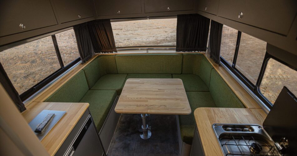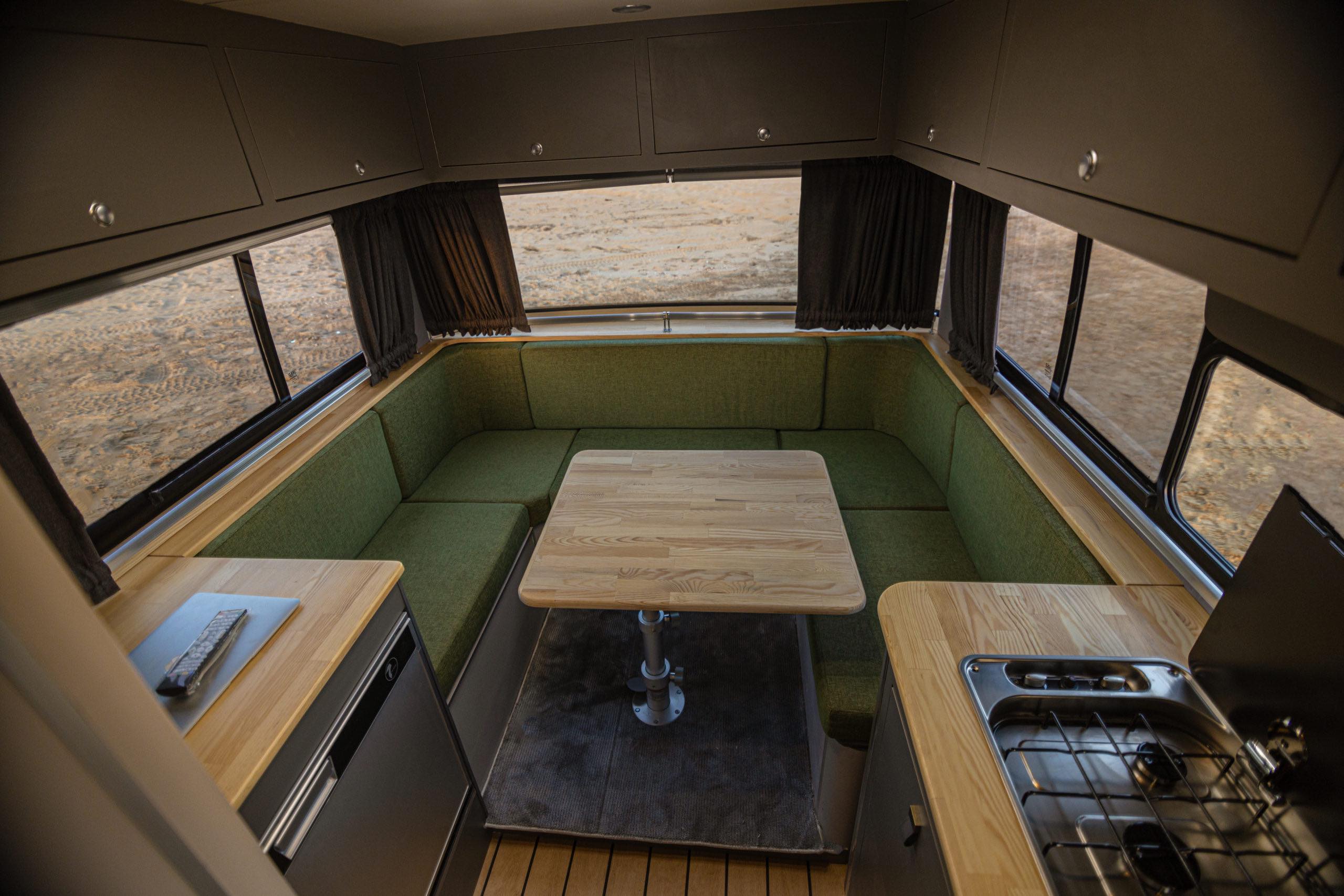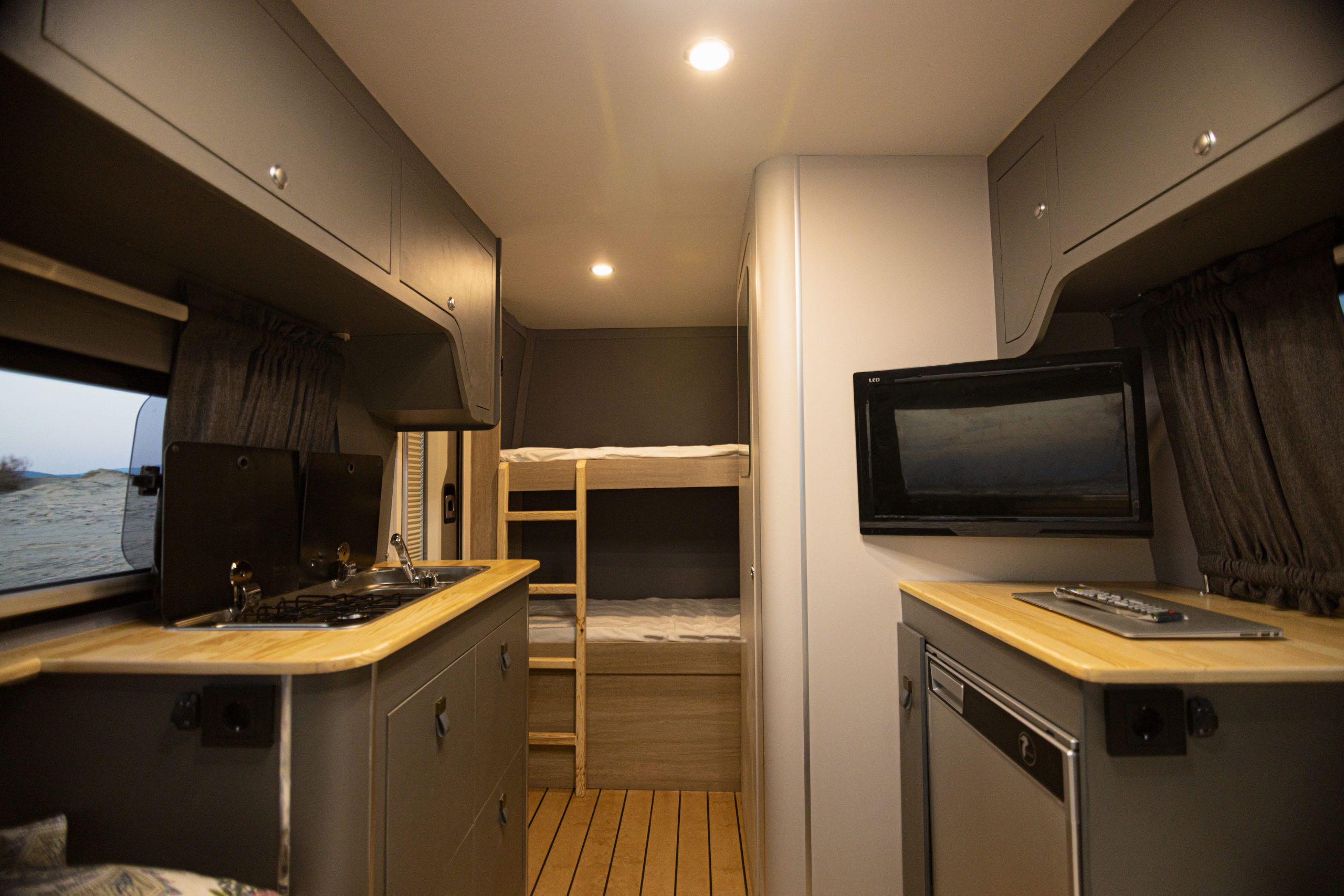 De nieuwe caravan is er in twee indelingen: voor twee personen en voor vier personen. In beide indelingen is er voorin een rondzit die kan worden omgebouwd tot een tweepersoonsbed van 1,50 bij 2 meter. Achterin is er de keuze uit een stapelbed of een ruime keuken. Kies je voor het laatste, dan heb je een groot werkblad en veel opbergruimte. In de indeling met stapelbedden bevindt de kleinere keuken zich in het midden.