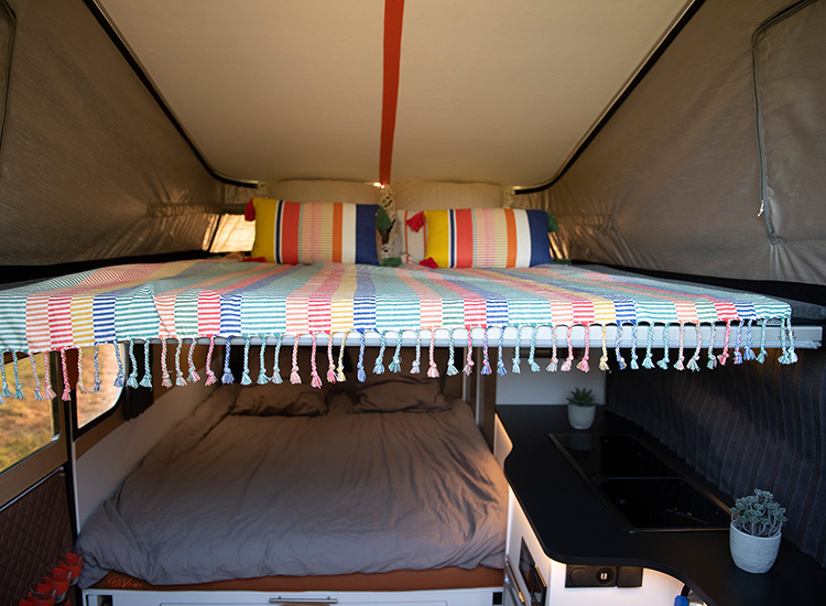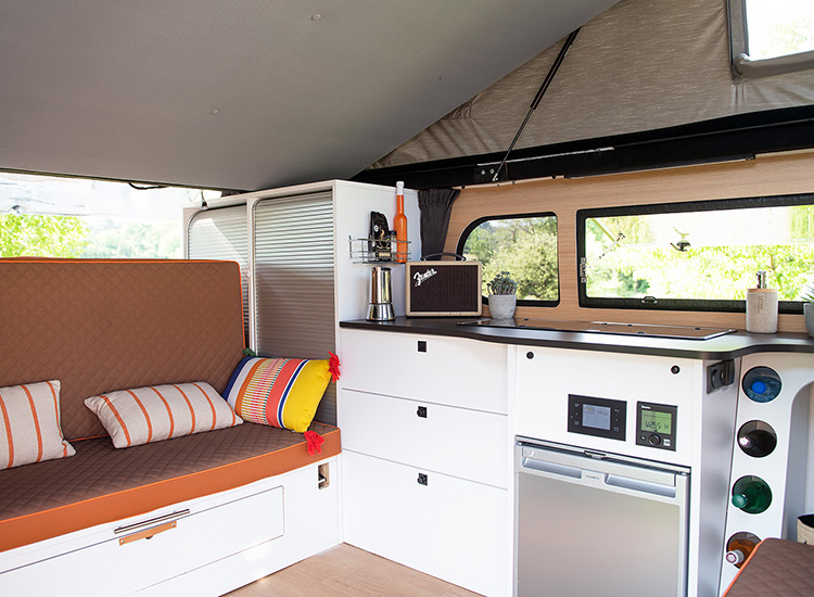 De indeling van de BiVan is voor een deel overgenomen uit de kampeerbus. We zien een achterbank, een tafel en twee tegenover elkaar geplaatste stoelen. Je kunt deze ombouwen tot een bed van 1,40 x 1,90 meter, wat het aantal slaapplaatsen in de caravan op vier brengt. Het keukenblok en de opbergruimtes zijn, net als in de vans, langs de zijkant geplaatst. Het keukengedeelte beschikt over een tweepitsgasfornuis, een roestvrijstalen spoelbak en een koelkast met een inhoud van 65 liter.