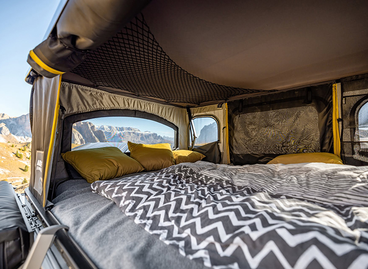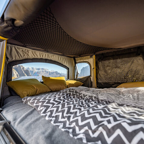 Die fietsen vervoer je veilig door ze in een soort lade te plaatsen. Deze kun je aan de achterkant in en uit de caravan trekken. Je begrijpt dat een caravan vol fietsen weinig ruimte overlaat om te slapen. Dat doe je dan ook in een daktent naar keuze, die op de rails boven op de trailer komt te staan.