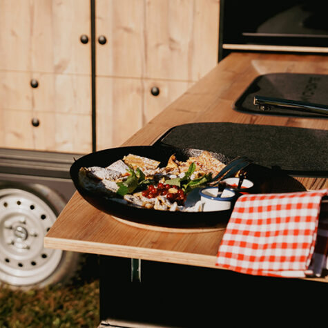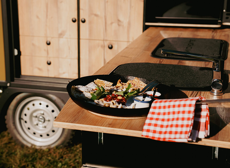Het pronkstuk van de Blackcamp FREEda is wat ons betreft de uitschuifbare keuken. Deze is gemaakt van massief hout en voorzien van compressorkoelkast inclusief vriesgedeelte, een verswatertank en een afvalwatertank. Ook inbegrepen zijn een tweepitsgasfornuis en een spoelbak van emaille. Extra kasten en lades zijn optioneel.