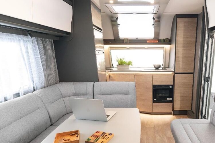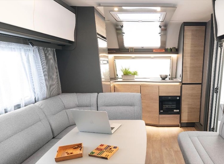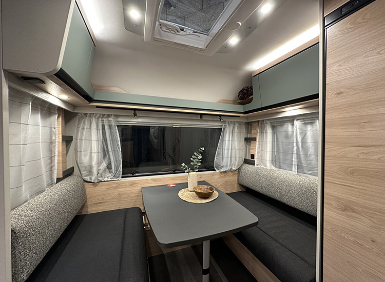 De Nomad is al vele jaren een geliefde caravan onder stellen en gezinnen die wel van wat luxe houden. Dat is ook precies wat het vernieuwde interieur uitstraalt. De warme houttinten en gecombineerd met verschillende kleuren grijs geven de caravan een elegant uiterlijk.