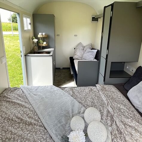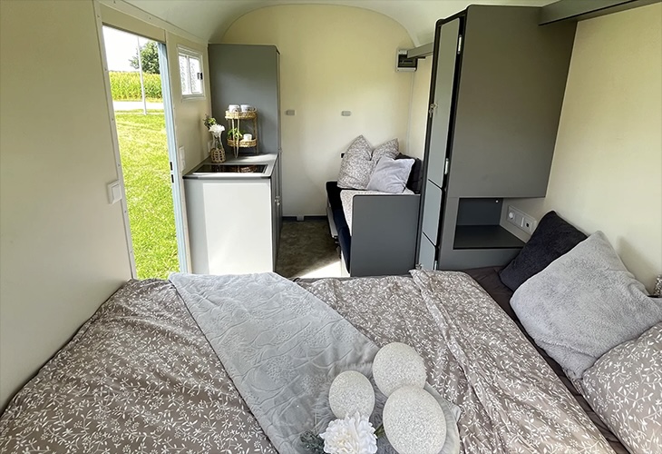 Als je door de grote toegangsdeur naar binnen stapt, tref je geen interieur dat zo uit een woonmagazine lijkt te komen. Wel zie je degelijke meubels en een praktische uitrusting. Deze omvat een tweepersoonsbed, een zitgroep, een kleine keuken (zonder koelkast en kooktoestel) en verrassend veel opbergruimte.