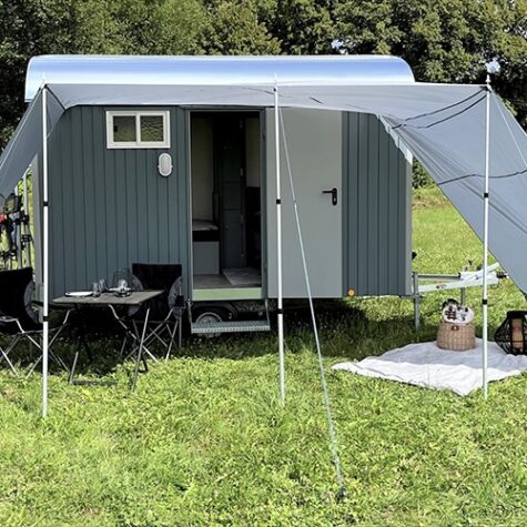 De Rasant Rolling Home staat op een stevig bouwwagenchassis en weegt 1250 kilo. De stevige constructie – inclusief een verzinkt metalen dak, veiligheidsglasramen en weerbestendige buitenbekleding – maakt hem bestand tegen alle weersomstandigheden. Je kunt hem dus prima in de openlucht stallen. De caravan, want zo noemen we hem voor het gemak toch even, heeft een opbouwlengte van 3,70 meter. Hij is 2,20 meter breed. Een aerodynamisch wonder is deze caravan niet, dus verwacht wel wat luchtweerstand als je ermee naar het zonnige zuiden zoeft.