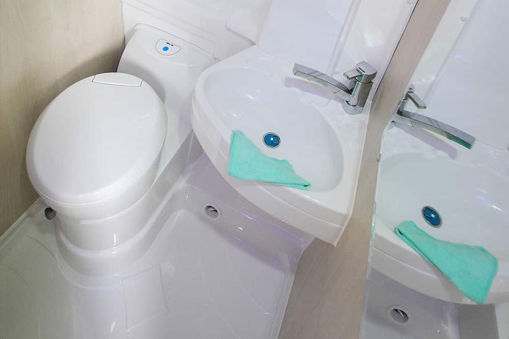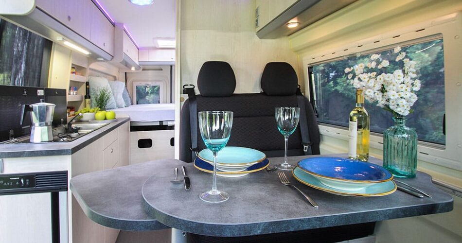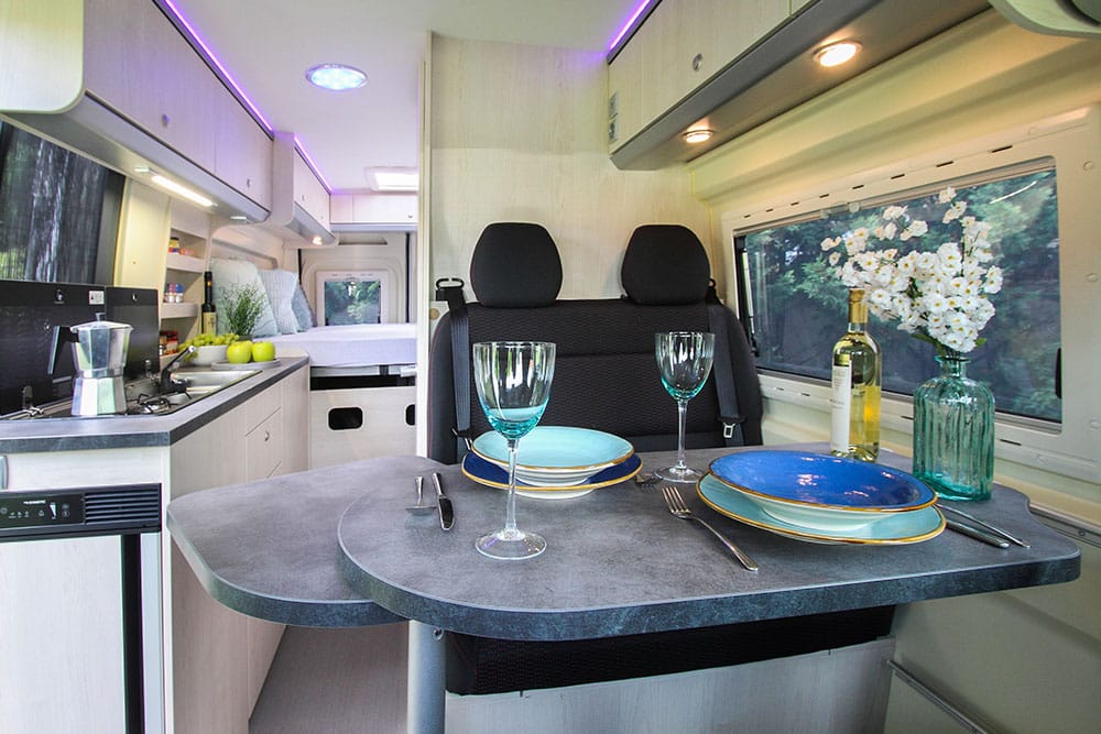 De indeling van de Move is verder klassiek te noemen. Het interieur van de in Hongarije gebouwde buscamper heeft een lichte houttint. De badkamer is voorzien van een – te openen – raam. Handig voor de ventilatie. In het dak zit een zogenaamde paddenstoel ter ontluchting. De zithoek is krap bemeten. Wil je normaal op de dinettebank kunnen zitten, dan moeten de cabinestoelen eerst worden omgedraaid. Anders kan de tafel niet ver genoeg naar voren.