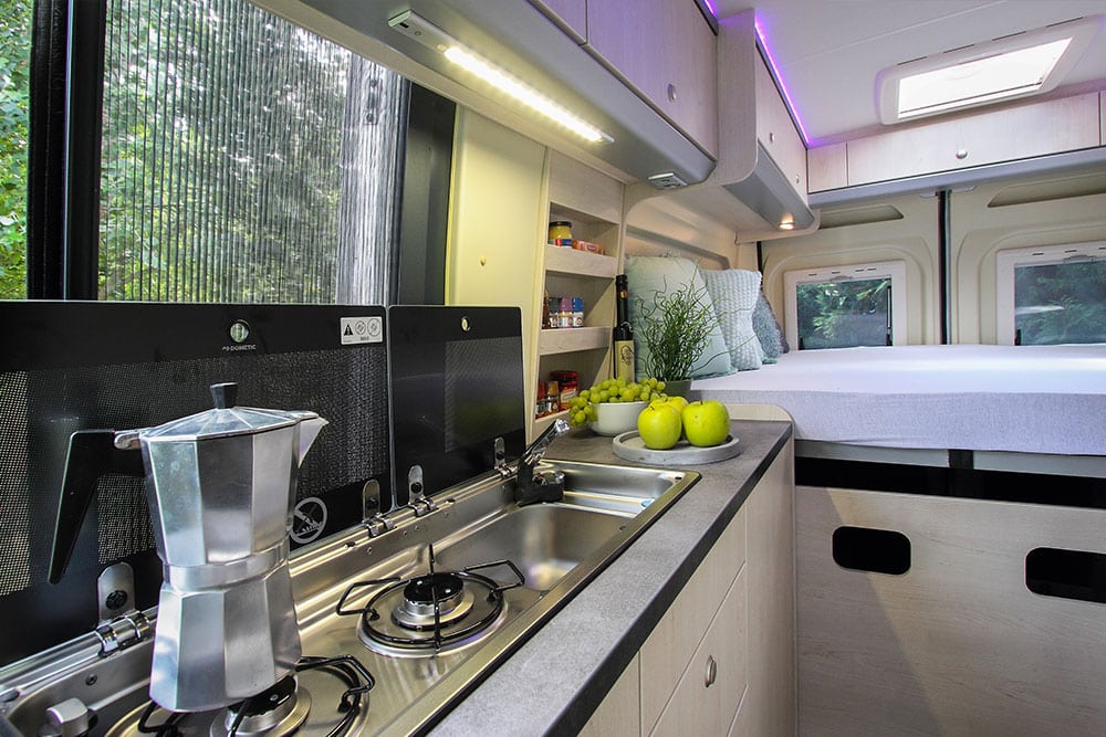 De koelkast – met een inhoud van 70 liter – staat aan de kopse kant van het keukenblok. Je pakt dus ook als je buiten staat gemakkelijk een koel drankje. Verder zien we twee pitten en een aantal laden om je keukenspullen in op te bergen. Voor de verwarming zorgt een Truma 4 Therme. De gasbun is van binnen bereikbaar. Is het gas op, dan hoef je dus niet de kou in om de fles te verwisselen.