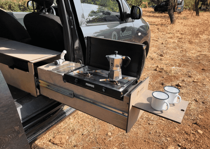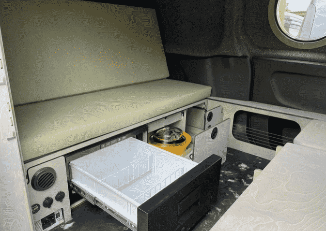 De Sliding Cook-unit is een luxe uitschuifbare keuken. Compleet met twee pitten, wasbakje en accu voor het waterpompje. Dan is er nog de Driver Side Low Storage. Zoals de naam al aangeeft, krijg je hiermee extra opbergruimte achter de bestuurder. Deze unit past alleen als je kiest voor een basisvoertuig met één schuifdeur. Ze zijn er namelijk ook met een schuifdeur aan iedere kant.