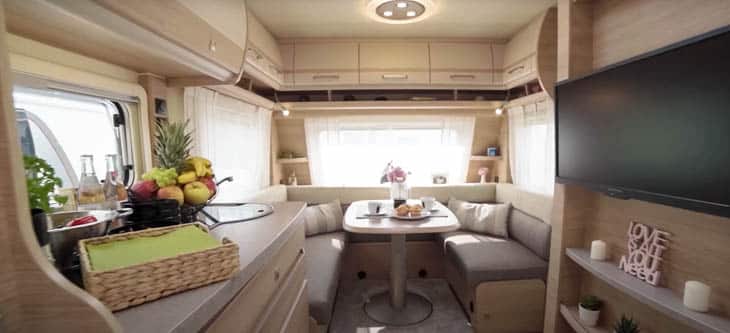 De Fendt Bianco Activ 465 SFH heeft zijn indeling afgekeken bij de Opal. Voorin zien we een ruime rondzit. Achterin staat het Franse bed. In het midden plek voor de ruime Slim Tower-koelkast. Je kunt hem zowel van binnen, als van buiten – door de deur – openen. Dat is handig, zo hoef je voor een koud drankje niet eerst naar binnen. Aan het meubel waar de koelkast in past, kan ook een tv worden gehangen. Je kunt zo zowel vanuit de zithoek als vanuit het bed televisie kijken. Handig.