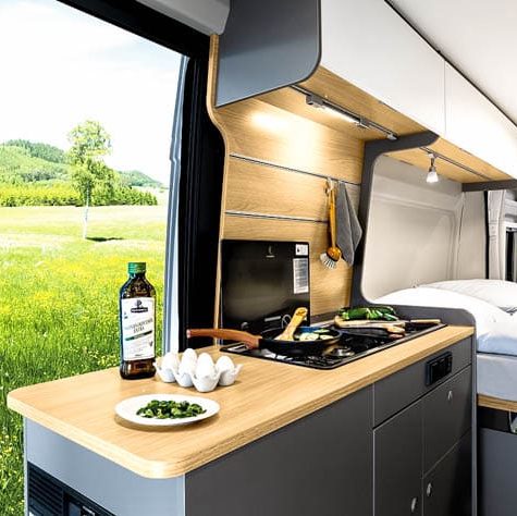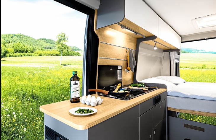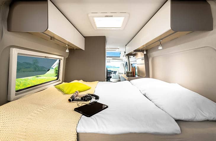 Je hebt keus uit twee keer een dwarsgeplaatst bed achterin of enkele bedden in de lengterichting. Het keukenblok staat in de deuropening van de schuifdeur. Tegenover het keukenblok de badkamer. Opbergruimte, een douche en een toilet. Prettig: de badkamer heeft zijn eigen raampje.