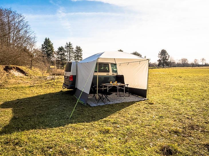 - De luifel past met een breedte van 2,6 meter en een diepte van 3 meter aan vrijwel elke bus.
