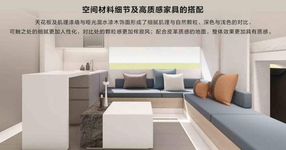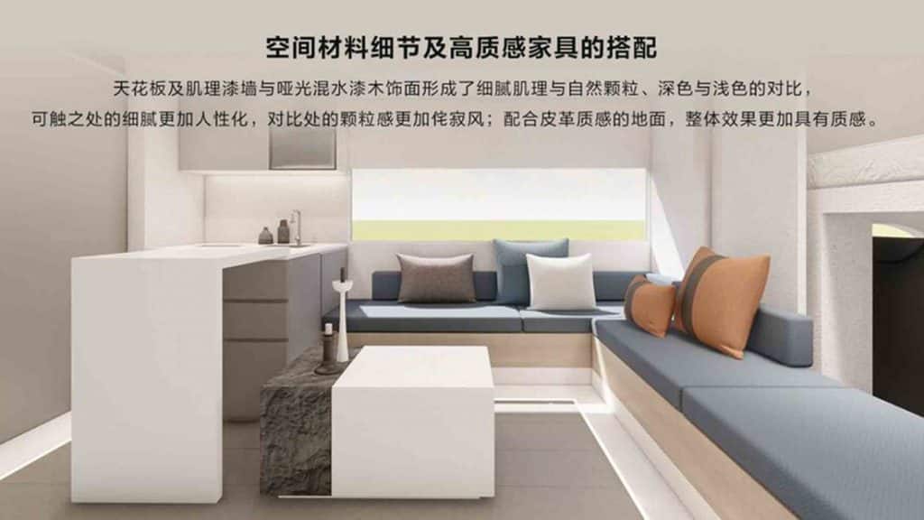 Een trap ontbreekt, daarvoor in de plaats achterin een heuse lift. Om in het 12,4 vierkante meter grote penthouse te komen kost zo amper moeite. Beneden heeft de Saic Maxus Life Home V90 Villa Edition aan iedere zijkant een slide-out. Daardoor heb je in totaal beneden 20 vierkante meter de ruimte in het interieur. We zien hier een riante L-vormige zithoek. Verder een flink bemeten tv-scherm en een entertainmentsysteem. Het is tenslotte een Chinese camper. Natuurlijk is de complete techniek in deze bijzondere camper via een app aan te sturen. Ook spraakbesturing zit erop. Denk aan: “Maxus, mag het licht uit?”, zoiets. Alles is met elkaar verbonden via het X-Connect RV Smart system. Een keuken, een barzit, een kachel en een oven zitten er ook in. Ook een koelkast ontbreekt niet, evenals een badkamer, die meteen naast de lift is te vinden.
