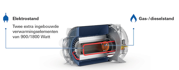 Met de Truma Combi 6E heb je snel een warme camper of caravan. Met de boost-functie warmt hij de binnenruimte namelijk tot aan 25% sneller op. Dat komt doordat het vermogen van de gasbrander en het elektrische verwarmingselement in deze stand worden gecombineerd. Je hebt zo 6900 watt aan vermogen. Bij de Truma Combi 6E zijn twee elektrische verwarmingsbuizen van elk 900 watt ingebouwd. Verwarm je op stroom, dan heb je een geruisloze verwarming. Ideaal voor de nacht. Natuurlijk is er ook geen uitstoot. Geen stroompaal voorhanden? Dan stook je zuinig op gas. Je kunt met deze Heat Hybrid heel flexibel overstappen van gas op stroom en weer terug.