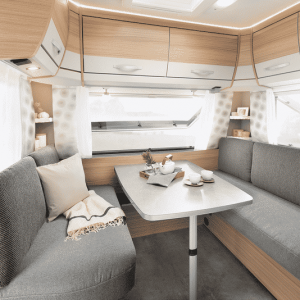 Bij de Dethleffs Nomad 510 LE heb je net wat meer de ruimte. De enkele bedden staan nu helemaal achterin. Daarvan maak je wederom desgewenst een ruim tweepersoonsbed. Voor die bedden aan de kant van de deur het keukenblok. Aan de andere kant de badkamer en kastruimte. Helemaal vooraan de ruime rondzit. De 510 LE heeft tot aan vier slaapplaatsen. Van de rondzit is namelijk een tweepersoonsbed te maken.