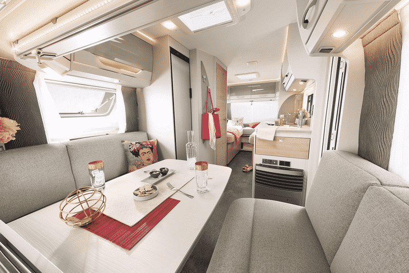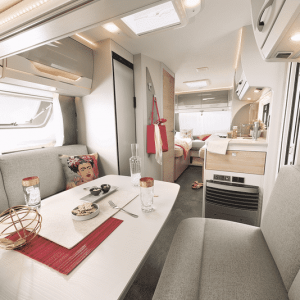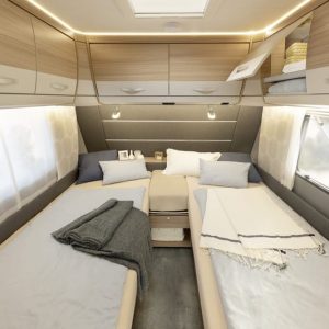 De Nomad 460 LE heeft voorin twee enkele bedden. Desgewenst maak je daar een zeer ruim tweepersoonsbed van. In het midden aan de kant van de deur het keukenblok. Daar tegenover de badkamer. Naast de badkamer staat de hoge koelkast met een inhoud van 142 liter. Achterin de treinzit waarvan een eenpersoonsbed te maken is. Boven de zithoek het uit de kluiten gewassen dakraam. Daar komt in de Avantgarde-uitvoering nog heel wat luxe en comfort bij.