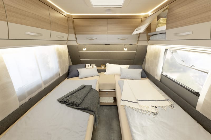 De Dethleffs Nomad is de perfecte caravan voor de veeleisende kampeerder. Er zijn maar liefst zestien indelingen om uit te kiezen. Van een elegante toercaravan tot aan een luxueuze tandemasser. Dus hij past altijd perfect. Aan de buitenkant zien we opvallende designdetails, zoals een verchroomde sierlijst aan de zijkant. Binnen valt naast het sfeervolle lichtconcept ook de ruim uitgeruste keuken met verlichte achterwand op. De Nomad is er met tweepersoonsbedden – zoals een queensbed in de lengte of een dwarsgeplaatst bed – en eenpersoonsbedden.