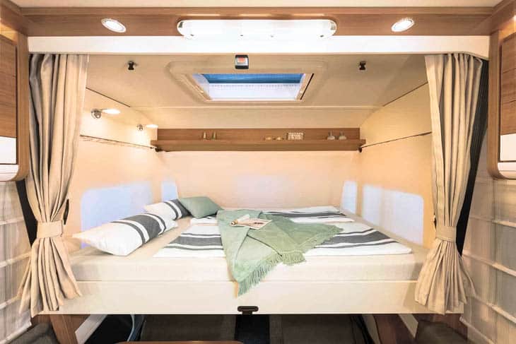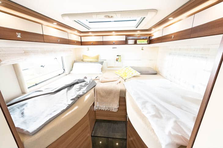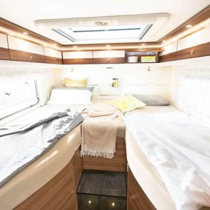 De hele camper ademt ruimte. Die kom je echt nergens te kort. Ook aan slaapplaatsen geen gebrek. Boven de ruime zithoek hangt namelijk nog een hefbed. Daarmee heb je in totaal vier ruime slaapplaatsen. Winterhard is deze Dethleffs XLi Edition natuurlijk ook. Prima geïsoleerd en voorzien van een dubbele bodem. Alle installaties zijn vorstvrij ondergebracht. Daar draagt ook de vloeistofverwarming haar steentje aan bij. De beide genoemde indelingen verschillen alleen wat de slaapkamer betreft van elkaar. Zoals genoemd staan daar enkele bedden in lengterichting of een queensbed. Voor de rest zijn ze gelijk. Ook de lengte is hetzelfde.