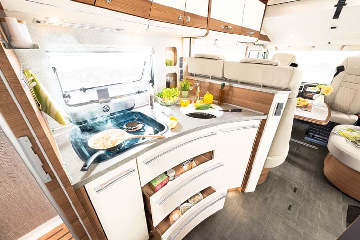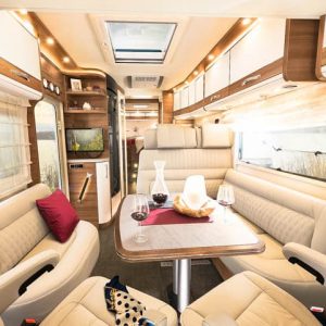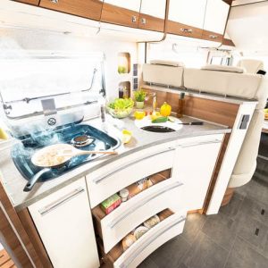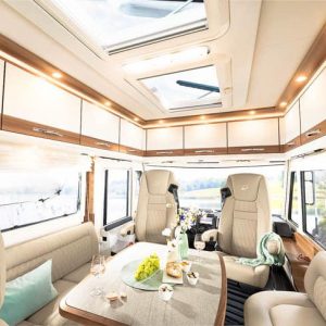 Tellen we de waarde van alle losse extra accessoires van dit jubileummodel bij elkaar op, dan gaan we over de 30.000 euro. We noemen een panoramadakraam boven de zitgroep en boven het bed. De extra deur aan de chauffeurskant. Een koelkast met een inhoud van 190 liter. En de oven. Niet gek dat je voor de XLi Edition 90 een C-rijbewijs nodig hebt. Met alle extra’s is een maximum gewicht van 5400 kilo geen overdreven luxe. Er is keus tussen een indeling met enkele bedden – de I 7850-2 EB – of met een queensbed. Die laatste heeft de letters DBM achter de typenaam staan. De exclusieve lederen bekleding hebben ze beide.