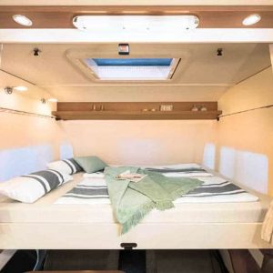 Van de enkele bedden achterin de I 7820-2EB maak je met een extra kussen binnen een mum van tijd een ligweide van maxiformaat. Aan het voeteneinde aan twee kanten een ruime kast. Met een gordijn is de slaapkamer af te sluiten van de rest van deze Dethleffs camper. De badkamer bestaat uit twee separate delen. Aan de ene kant de wastafel en het toilet. Aan de andere kant de douchecabine. Door het openklappen van de twee deuren voeg je de ruimtes samen en maak je er één grote badkamer van.