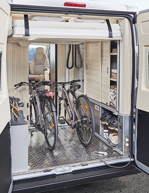 Het keukenblok met twee pitten staat deels in de opening van de schuifdeur. Daarnaast staat de koelkast, die met een inhoud van 149 liter lekker groot is. Ook ruim uitgevoerd is de badkamer die tegenover de koelkast staat. Hij meet 90 bij 73 centimeter en heeft een stahoogte van 1,97 meter. De schuifdeur zorgt dat het water tijdens het douchen binnen blijft. Helemaal achterin zijn de bagageruimte en het bed te vinden. De ruimte tussen de lage kasten is 1,20 meter breed. Van achterdeur tot tussenschot meten we 1,93 meter in de lengte. Genoeg voor de meeste fietsen.