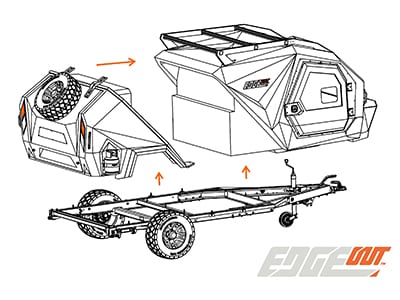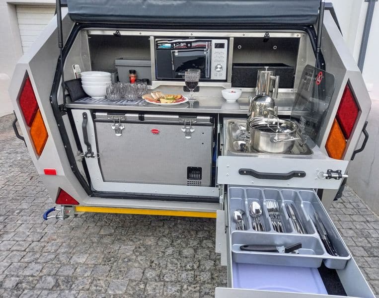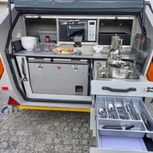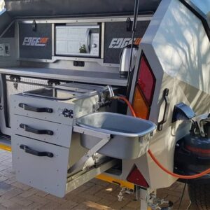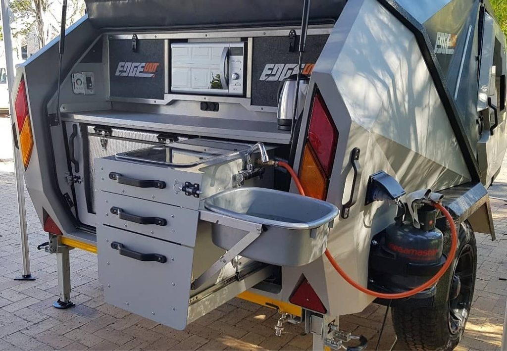 De caravan bestaat uit twee afzonderlijk gegoten units: een slaapcabine en een buitenkeuken. De laatste bevindt zich aan de achterzijde van de Edgeout en heeft onder meer een tweepits gasstel, een koelkast en een magnetron. Een prima uitrusting voor zo’n kleine caravan dunkt ons.