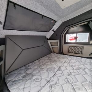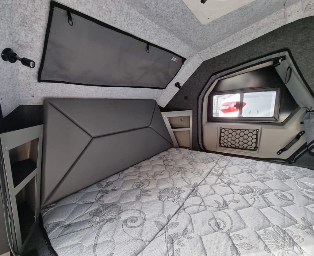 Zoals de foto’s al doen vermoeden is de Edgeout een caravan voor twee personen. De slaapcabine heeft een bed van 1,45 bij 2 meter. Wil je toch met vier personen op pad? Dat kan als je voor de optionele daktent kiest.
