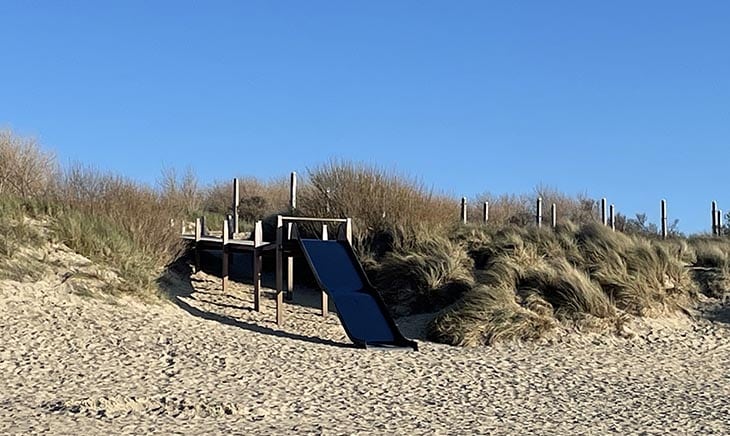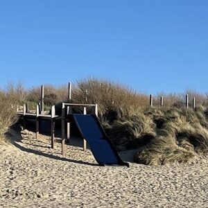 In het duin is een glijbaan gemaakt. Je glijdt dus zo het strand op. Echt leuk! Ook heb je zicht op Vlissingen en op de vele schepen die voorbijkomen. We hebben genoten van het strand. Zonneweelde verhuurt trouwens ook jaloersmakend mooie strandhuisjes. Die gaan op ons verlanglijstje.