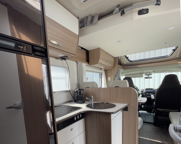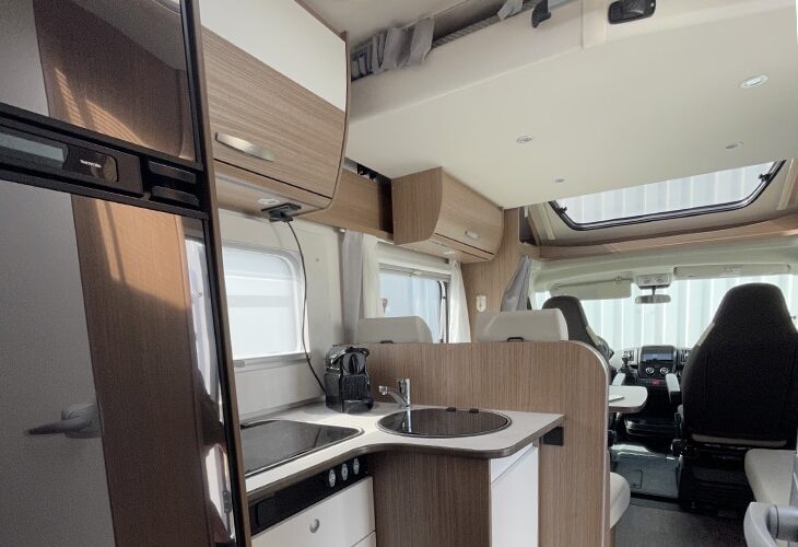 De compleet ingerichte Carado T 448, zelfs met een Nespresso-apparaat. Bovenin zie je het hefbed waar de jongens sliepen.