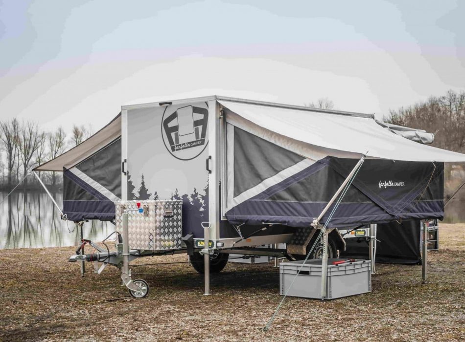 Farfalla camper is bekend van de gesloten aanhangwagen die je op de plaats van bestemming uitklapt waardoor je een caravan hebt. Tot voor kort was deze verkrijgbaar zonder sanitair, maar daar is verandering in gekomen. Er is nu ook een uitvoering van de uitklapbare caravan mét toilet en wastafel: de Farfalla camper LS.