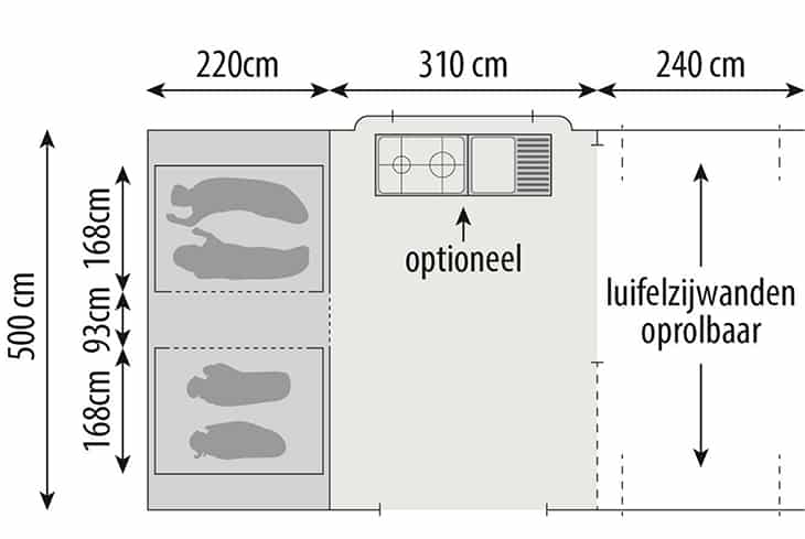Het slaapgedeelte van de Sunrider XL bestaat uit twee delen. In elk deel ligt een matras van 2,10 x 1,68 meter op een dubbele lattenbodem. Zijn er meer slaapplaatsen nodig? Kies dan voor de optionele ondertentjes. Hier kunnen nog eens vier personen slapen. Het slaapgedeelte heeft een donker tentdoek, waardoor je ook op zonnige ochtenden nog even kunt blijven liggen. De gehele wagenbak is 2,20 x 5,00 meter en ook los op te zetten. Dit maakte de vouwwagen ook geschikt voor een enkele overnachting wanneer je op doorreis bent.