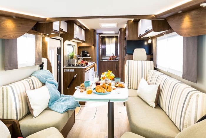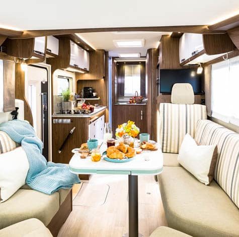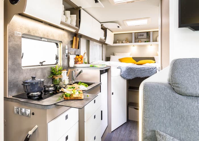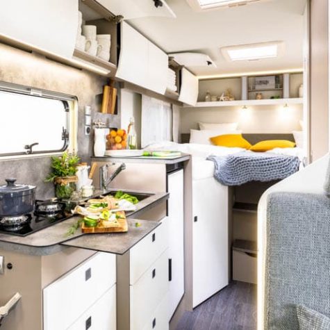 Een compacte halfintegraal met heel veel binnenruimte op basis van de Sprinter. Dat is de Frankia Neo GDK (foto boven artikel). Door de lichte bouwwijze blijft deze camper onder de 3500 kilogrens. Dan heb je een laadvermogen van 524 kilo. Heb je daar niet genoeg aan, dan is er ook de variant met een maximumgewicht van 4500 kilo. De Frankia Neo camper zit vol slimme oplossingen. Zo creëer je in de badkamer een grote douchecel door het toilet te verschuiven. De ruime garage is heel eenvoudig bereikbaar door het grote luik aan de zijkant en de megagrote achterklep. De dubbele bodem biedt ook veel opbergruimte. Daarnaast een hoog wooncomfort en alle rijgenot van de Mercedes Sprinter. Lees hier ons artikel over de Frankia Neo.