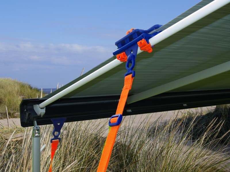 Niet alleen irritant, ook reden om je voortdurend af te vragen of je hem niet beter kunt inrollen. En dus kreeg Peggy Peg, je weet wel, van die blauw-oranje haringen en zo, daar veel vragen over. Zodoende is er nu een “anti-flapper klem” voor de luifel. Je schuift de klem vanaf de zijkant op het doek van de luifel. Vastzetten doe je hem aan de bestaande stangen. Met een hendel zet je de boel vervolgens strak. Beschadigen van het luifeldoek is overigens onmogelijk. De klem is gemaakt van een heel zachte kunststofmix. Met nieuw ontwikkelde tape zet je de klem uiteindelijk vast. Dit voorkomt dat hij op de meestal ronde stang weg zou kunnen glijden.