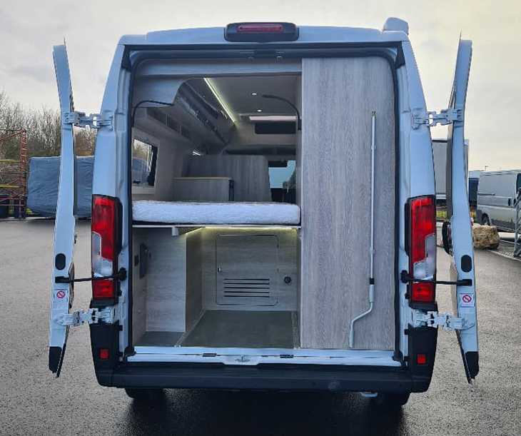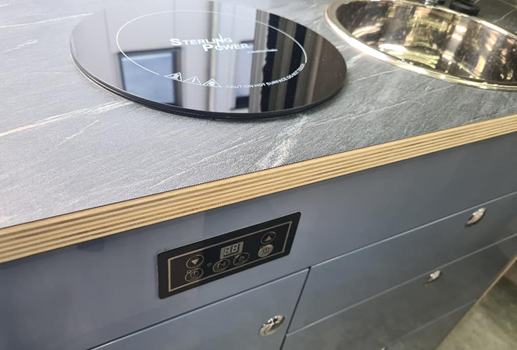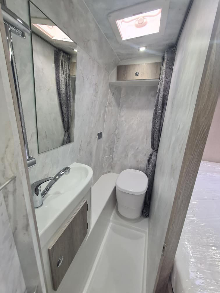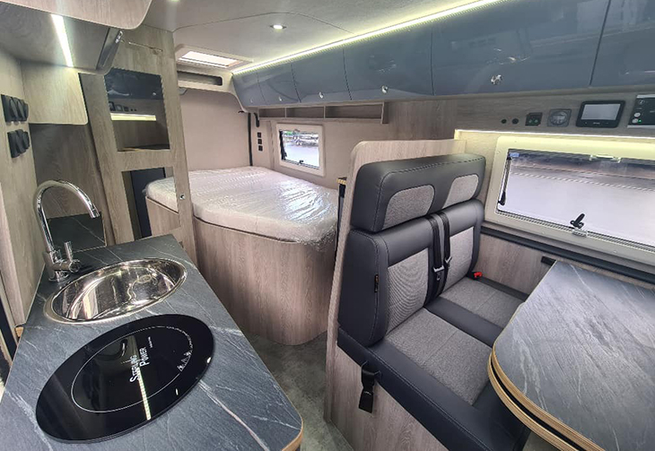 Het interieur van de 6 meter lange Balcamp 610-for-2 is ruim van opzet. Dat is te dank aan de keuze voor een Frans bed, met daarachter de badkamer. In de verte doet dit denken aan de Affinity Duo, eveneens een buscamper uit Polen, die ook een ruim interieur met een Frans bed heeft. Toch is de nieuwe Balcamp daar verder niet mee te vergelijken. Want waar in de Affinity een vaste zitgroep ontbreekt, heeft de Balcamp wél een klassieke halve dinette. De keuken, met ronde spoelbak en ronde inductiekookplaat, is aan de passagierskant geplaatst. Hier is ook een Thetford-compressorkoelkast van 90 liter te vinden. Van de zitgroep is nog een derde bed te maken. Links van het bed geeft een deur toegang tot de badkamer, met toilet, wastafel en douche. Het toilet is het noemen waard. Hier koos Balcamp namelijk voor een droogtoilet zonder water en chemicaliën.