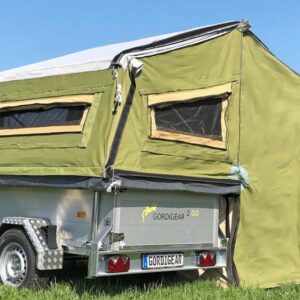 Als je al een aanhanger hebt – met randen van 90 tot 125 centimeter hoog – koop je de losse tent. Heb je die niet, dan bestel je de aanhanger erbij. Je krijgt dan een zogenoemde tenttrailer van Australische makelij. De Duitse vestiging van het Australische Gordigear kwam met het idee van de 2 Go. Deze tenttrailer is tijdelijk te koop vanaf 11.110 euro. Dat is de introductieprijs, normaal betaal je 12.608 euro.