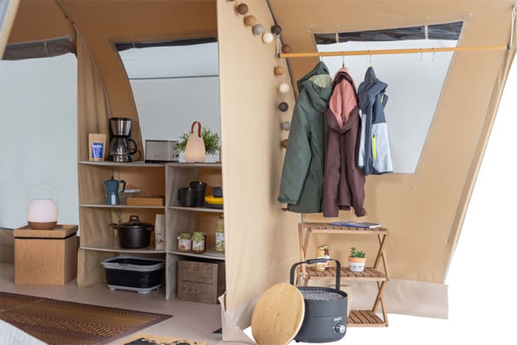De 1,60 meter diepe luifel behoort tot de standaarduitrusting van de Imperia tunneltent. Deze luifel is aan de zijkanten voorzien van ringetjes waaraan je van alles kunt ophangen. Bijvoorbeeld een kapstokje of een leuk lichtsnoer. Optioneel is er nog een regenluifel verkrijgbaar. Ook op de optielijst: diverse opbergmogelijkheden. Zo biedt Karsten een dressoir dat aan beide kanten van het zijraam is in te ritsen en handig als kastje is te gebruiken. Is het dressoir niet in gebruik? Dan is hij als plat pakket weg te zetten. De Imperium is optioneel ook uit te breiden met een organizer om spulletjes in op te bergen.