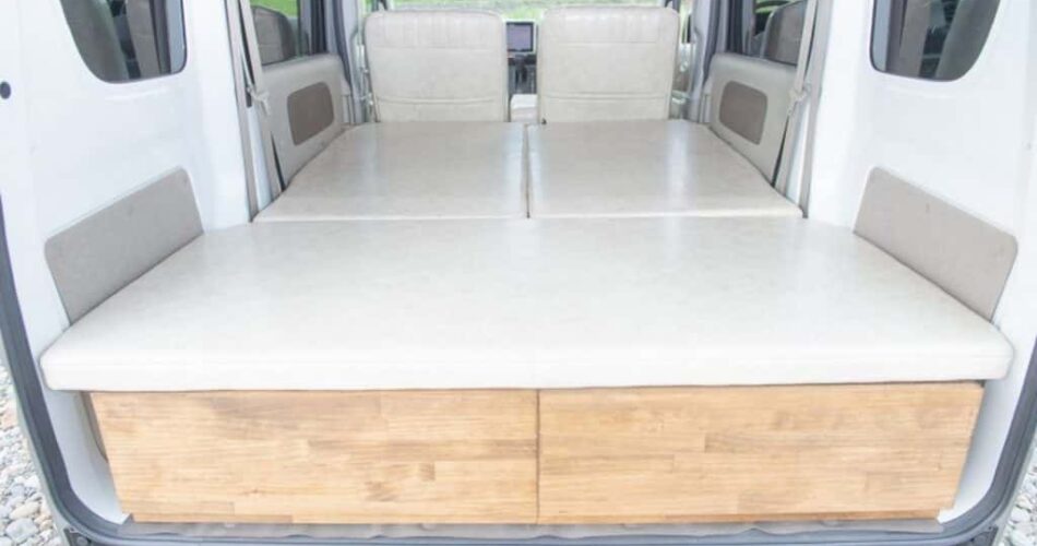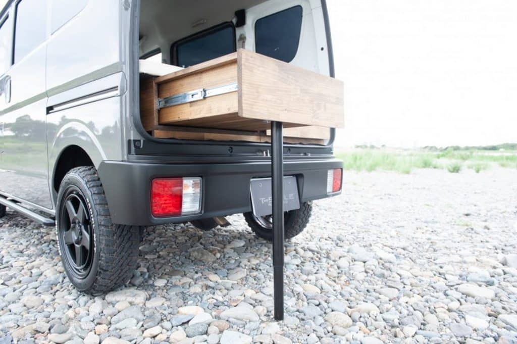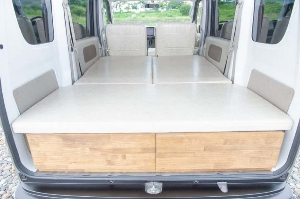 Wie al een Every minibusje heeft, kan zelf aan de slag. Het opvallende neusje is namelijk los te koop. Er zitten een grill, motorkapje en bumpertje in het pakket. Je kunt het er zelf opschroeven. In Japan betaal je er 2180 dollar voor. Maar dan ben je nog niet klaar. Vervolgens moet je er nog een minicamper van maken. Dat begint met de pop-up daktent. En een soort platte kistenset voor achterin. Daarvan maak je met kussens een bed. Het is ook meteen opslagplaats annex uitschuifbaar keukentje.