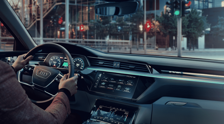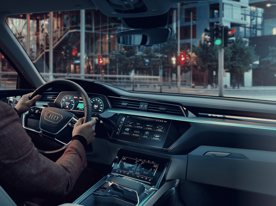 De Audi e-tron 55 Quattro is een lust voor het oog. Al blijft dat natuurlijk een kwestie van smaak. Wil je de Audi opladen, dan duw je op het knopje van het tankklepje. Pardon, oplaadklepje. Dat schuift daarna naar beneden. Ben je klaar met laden en trek je de stekker eruit dan schuift het klepje 5 seconden later automatisch weer op zijn plek. Wij houden ervan. Het dashboard is ongeloofllijk strak. Het is opgebouwd uit horizontale lagen. Deze suv heeft 660 liter aan bagageruimte. Dus er past ook heel wat vakantiebagage in deze trekauto. Het top-infotainmentsysteem met navigatie – en 4G wifi – zorgt onderweg voor een muziekje en wijst de weg naar je vakantiebestemming.