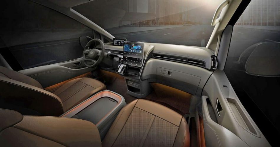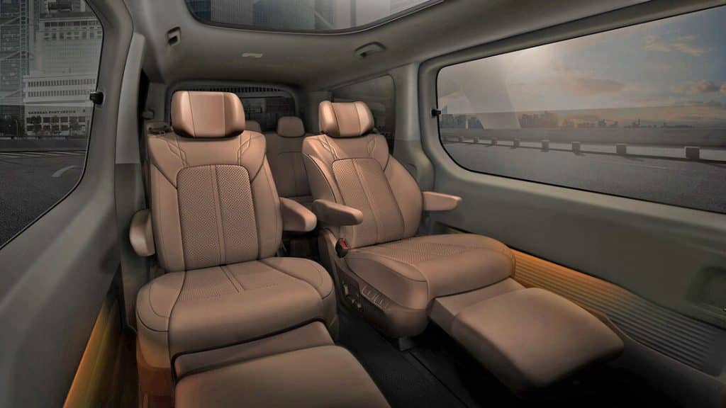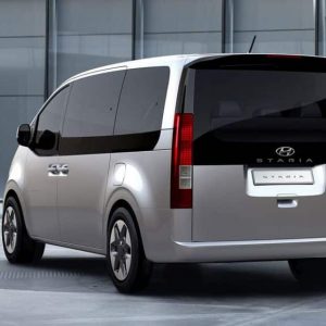 Wat als eerste opvalt is het futuristische uiterlijk. De dagrijverlichting bestaat uit een lange strip over de volledige breedte van de voorkant. Daaronder vierkante led-lampen verstopt in een grote grill. De achterklep loopt door tot aan de bumper en is elektrisch te openen en sluiten. Aan beide kanten ernaast een streep als achterlicht, zoals we dat kennen van de Cadillac. Zowel links als rechts heeft de Hyundai Staria een schuifdeur. Ook deze deuren zijn elektrisch te openen en sluiten.