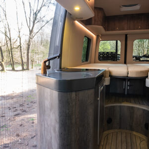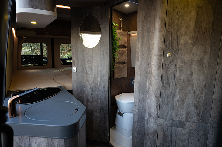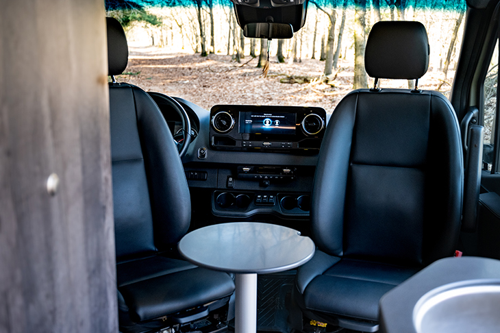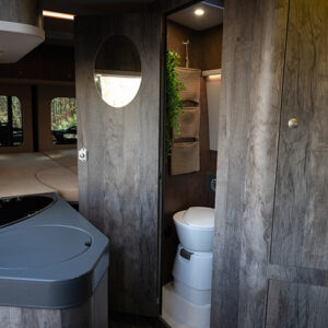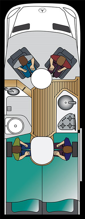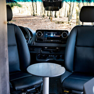 Voor het interieur van de Roadtrip Adventure Line koos Innova een robuuste look, die toch warm en sfeervol is. De camper heeft twee zitmogelijkheden, zoals we die kennen van andere Roadtrip’s. Tussen de bedden achterin de camper is een ovale tafel geplaatst. Met twee rugkussens is van de bedden een loungezit te maken. Net zo makkelijk maak je er weer een bed van. Bij de draaibare cabinestoelen is ook nog een tafeltje te vinden. Verder heeft de keuken een werkblad van composiet en is het sanitaire gedeelte standaard uitgerust met een Dometic-toilet. Ook bij de Adventure Line biedt Innova de mogelijkheid om eigen keuzes te maken, bijvoorbeeld qua kleur of matras. De indeling van de camper blijft hetzelfde.