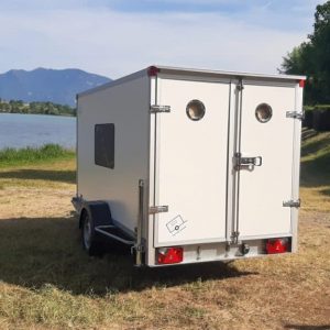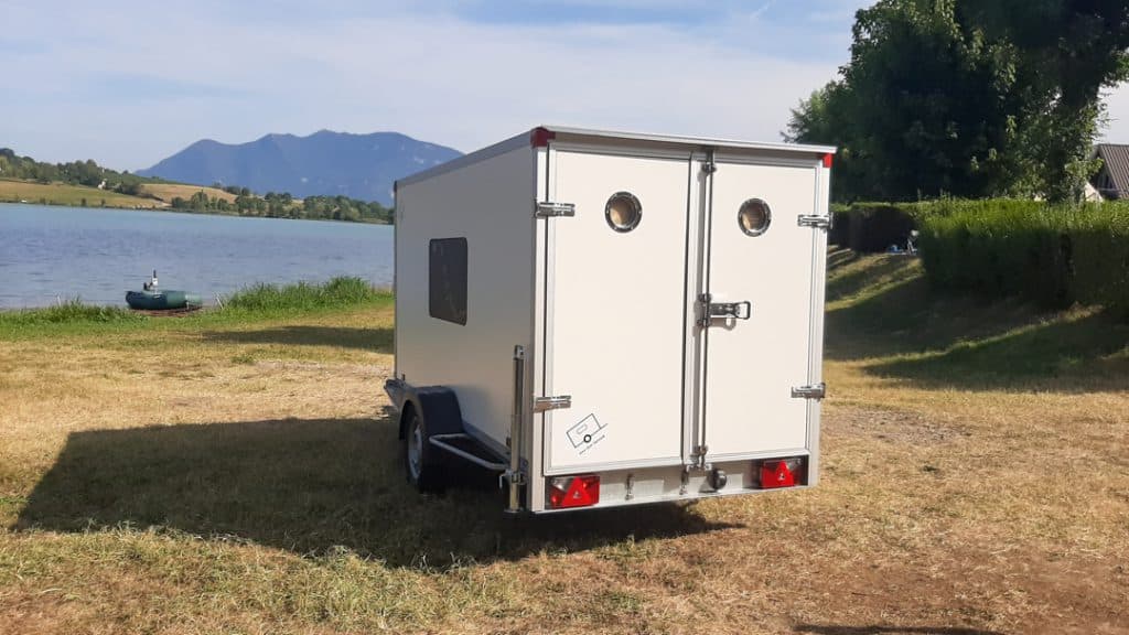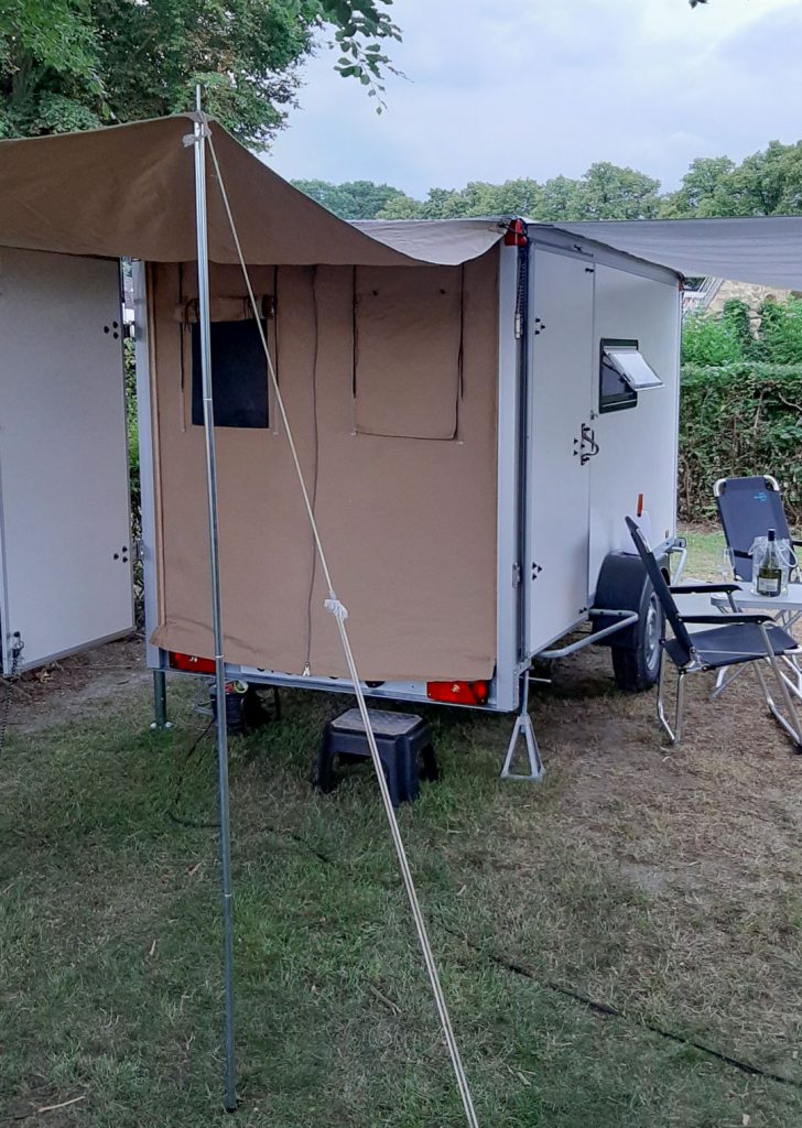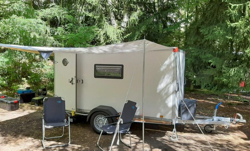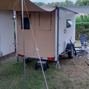 De Tiny Trip Trailer is gebouwd op basis van een nieuwe geremde aanhanger met een bak van 3 meter lang en 150 cm breed. Desgewenst kan deze hoger en/of langer worden. Het uitneembare tweepersoonsbed is 1,50 x 2,00 meter. De zijluifel meet 3 meter en de achterluifel 1,50 meter. Er is een 220 volt stroomaansluiting met driewegstekkerblok, een 220 volt-koelkast, patrijspoorten in de achterdeuren, een dakluik en een zijraam, beide voorzien van een anti-muggenhor. De vloer van de aanhanger heeft een vastzetrail. De Tiny Trip Trailer is verkrijgbaar vanaf 4495 euro. Meer weten? Kijk dan hier.