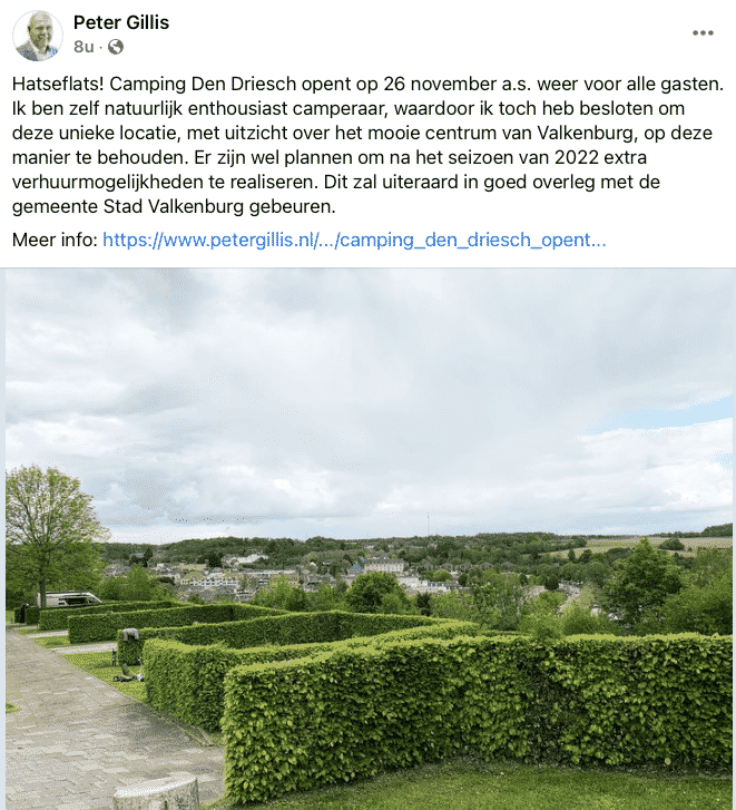 We weten natuurlijk niet of Peter Gillis – of de gemeente Valkenburg – alle reacties die dit besluit opriepen hebben gelezen. Maar Gillis heeft in ieder geval een draai gemaakt. ‘Omdat ik zelf een enthousiast camperaar ben’, zo laat hij op social media weten. Hij wil de plek daarom bij nader inzien toch behouden voor campers. En naar we aannemen ook voor caravans. Of zoals hij het in eigen woorden zegt: